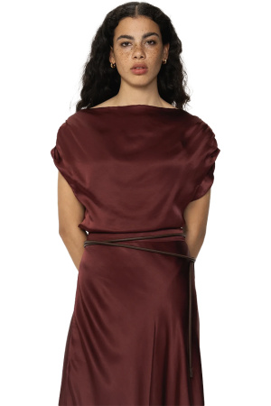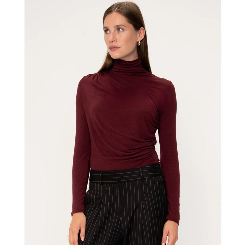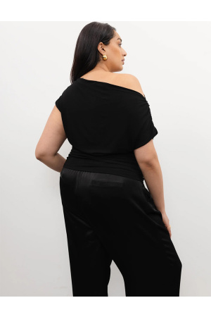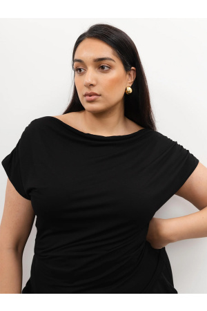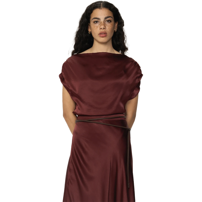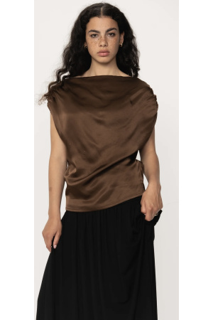VIVEH Ruta-toppen har en litt mer avslappet passform rundt skuldrene og en bred, hengende utringning, som skaper en elegant drapering over brystet. Den kan