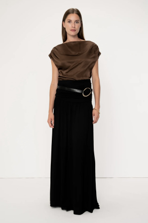 VIVEH Petunia er et maxi-skjørt som har en tilpasset linning som kan brukes sammenfoldet eller utfoldet, og tilbyr allsidige stylingsalternativer.