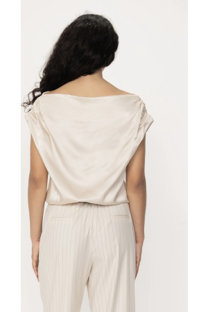 Adhara er en avslappet topp laget i en delikat rayon-viskoseblanding. Toppen har vid hals og rynkede skuldersømmer som skaper myke