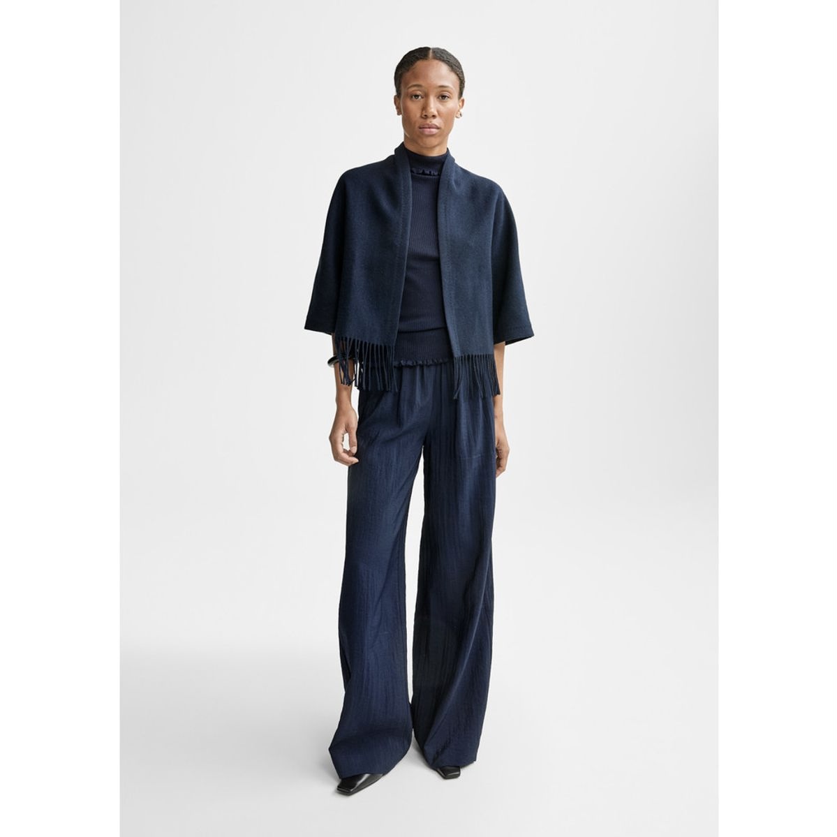 Akila Jacket er laget av myk lammeull. Den har et rent og tidløst design med frynser nederst. Med innvendige midjelommer