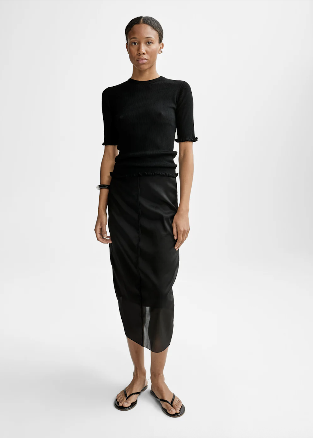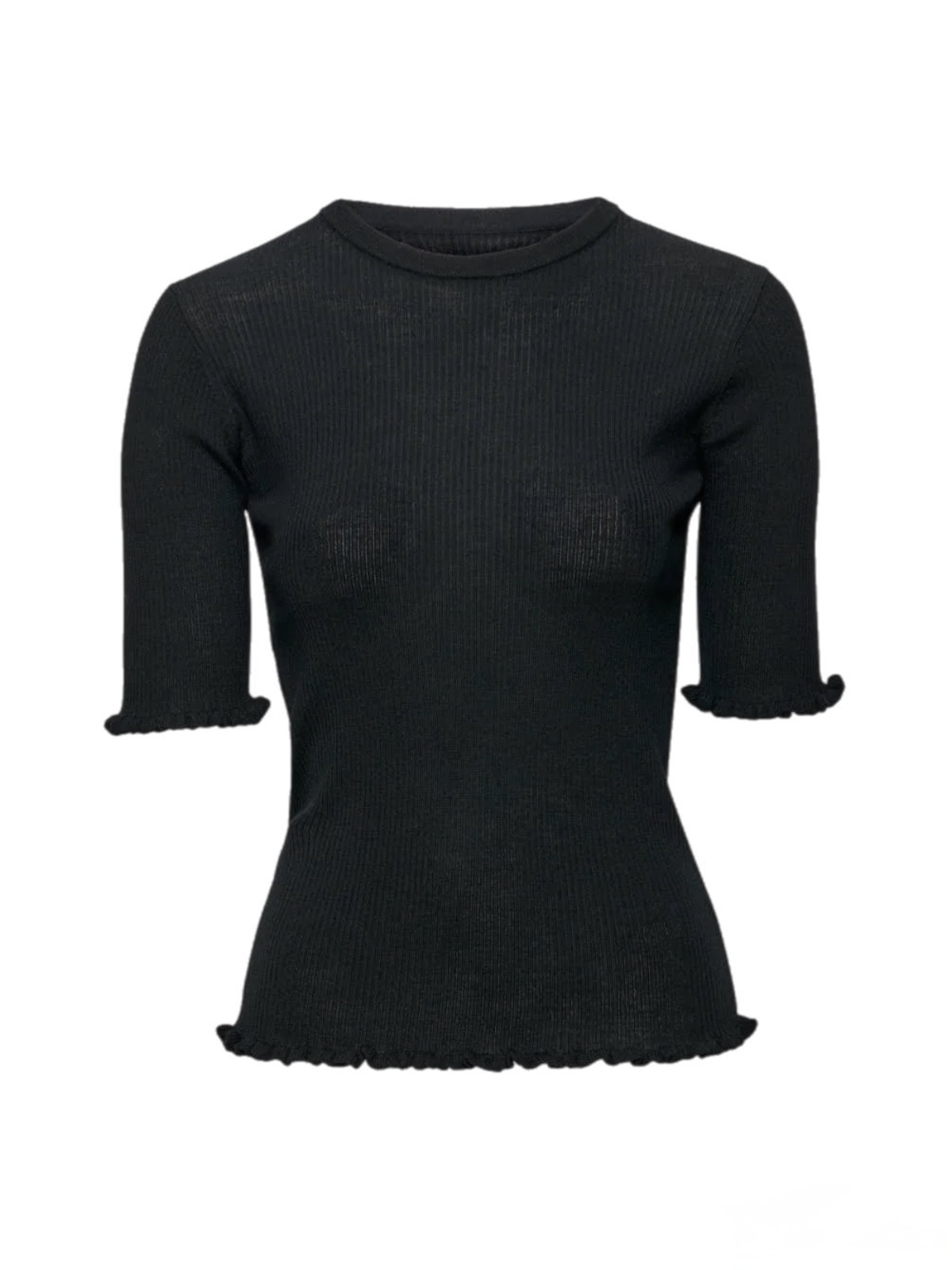 Milla Merino Knit fra AKS er en ribbestrikket topp i myk merinoull, avsluttet med delikate volangdetaljer nederst og ved ermene.
