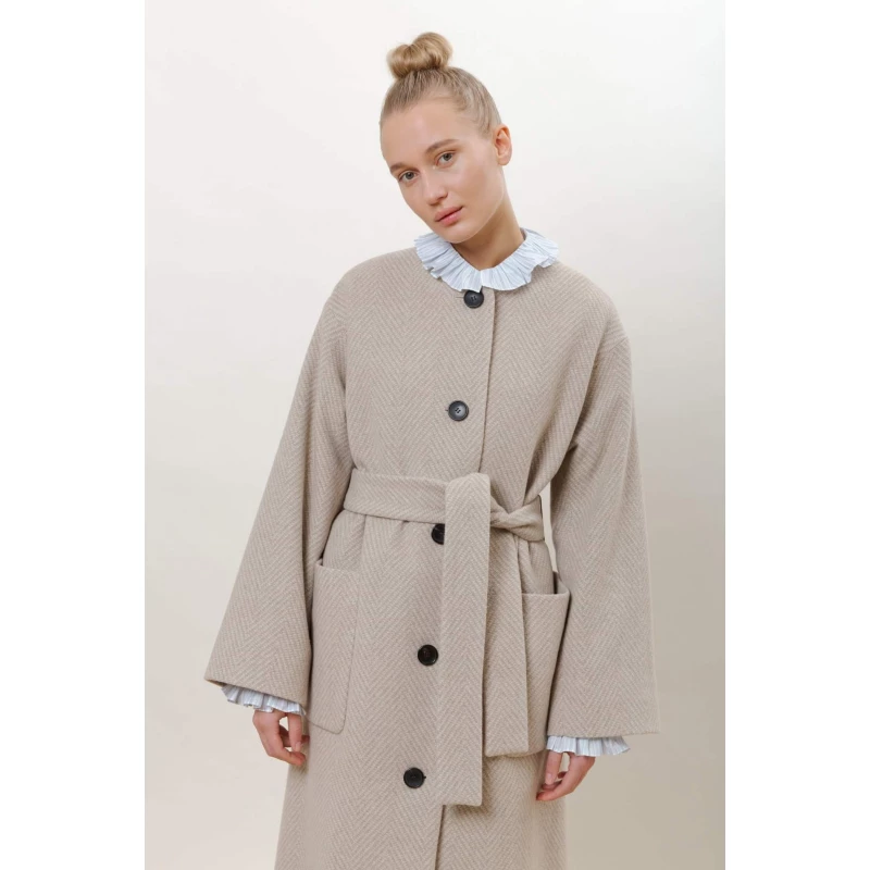 Kåpen er designet uten krage, har store passpollommer, samt et belte som kan knytes i livet.