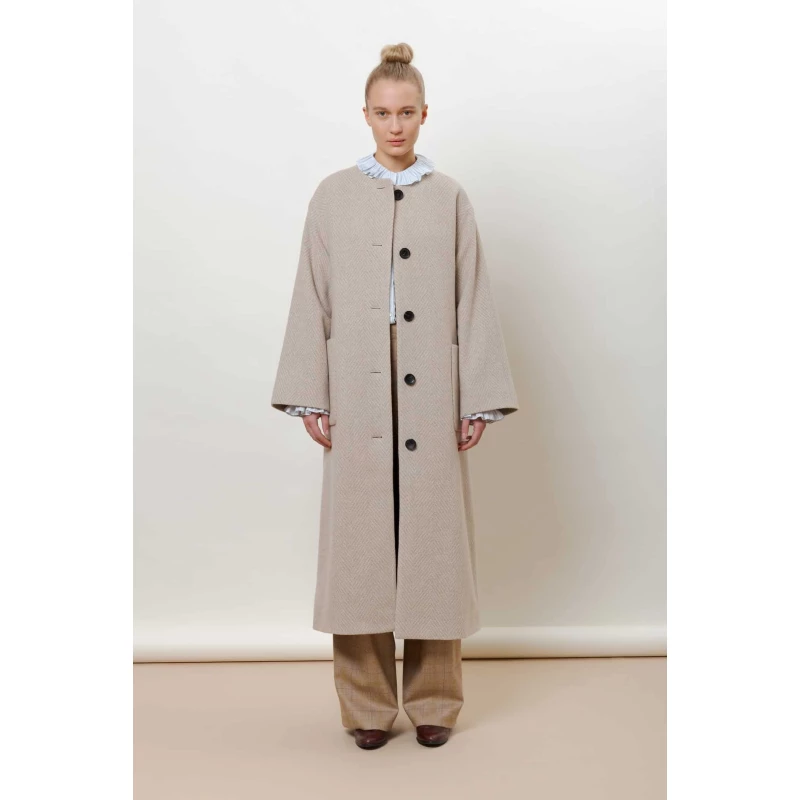 Dafne Coat, et plagg som eksemplifiserer APOFs dedikasjon til detaljer, komfort og tidløs brukervennlighet. Denne kåpen er laget av en luksuriøs resirkulert ullblanding, med et delikat greige fiskebeinsprint.
