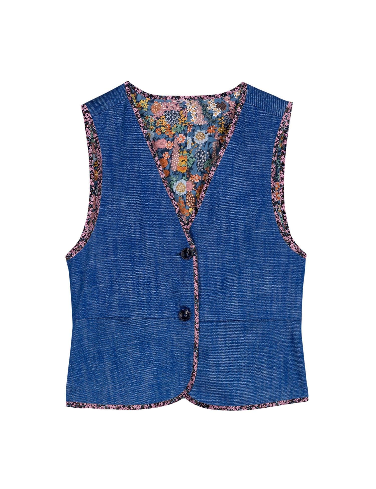 Dua er en vendbar vest med en litt skreddersydd silhuett. Laget i en nydelig kombinasjon av denim og Libertys blomsterprint Ciara. Vesten er detaljert med Liberty-pipings og knapper foran. Perfekt tillegg for å gi antrekket ditt en kul dimensjon.
