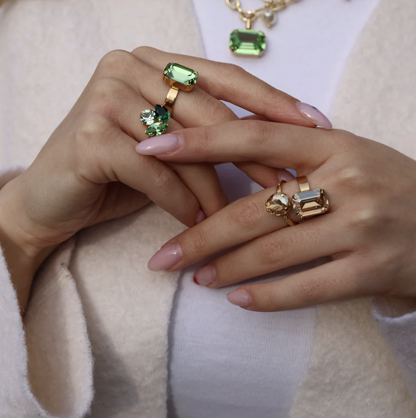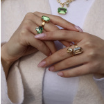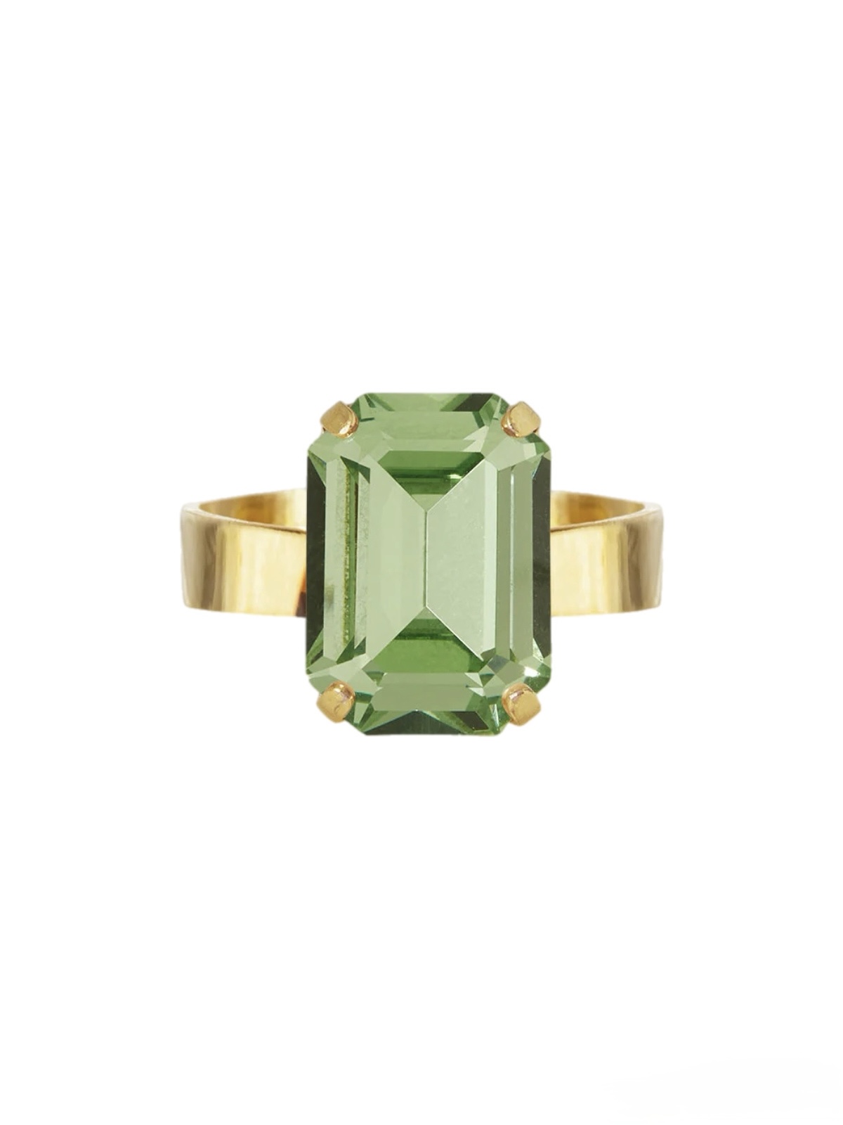 Lydia Ring Gold Peridot fra Caroline Svedbom kombinerer enkelhet med tidløs eleganse. Den rektangulære krystallen glitrer vakkert og gir ringen et uttrykk som fanger blikket uten å være prangende. En ring som tilfører et hint av glans til både hverdagsantrekk og mer pyntede anledninger.
