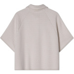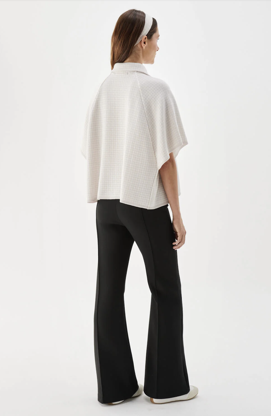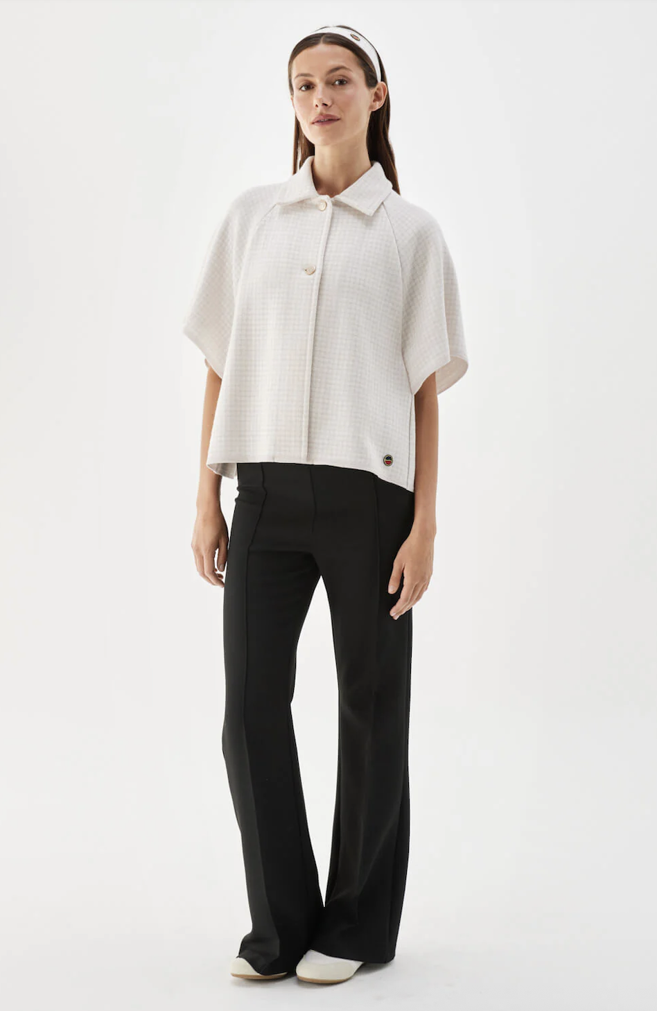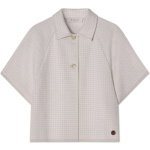 Amelie Cape. Amelie Cape fra Busnel er en kortermet enkelspent cape laget i en blanding av ull og viskose. Den har krage, gullfargede knapper og vide, korte ermer. Det diskrete rutemønsteret gir et elegant uttrykk, Kommer i et lyst rosa-hvitt rutete mønster.