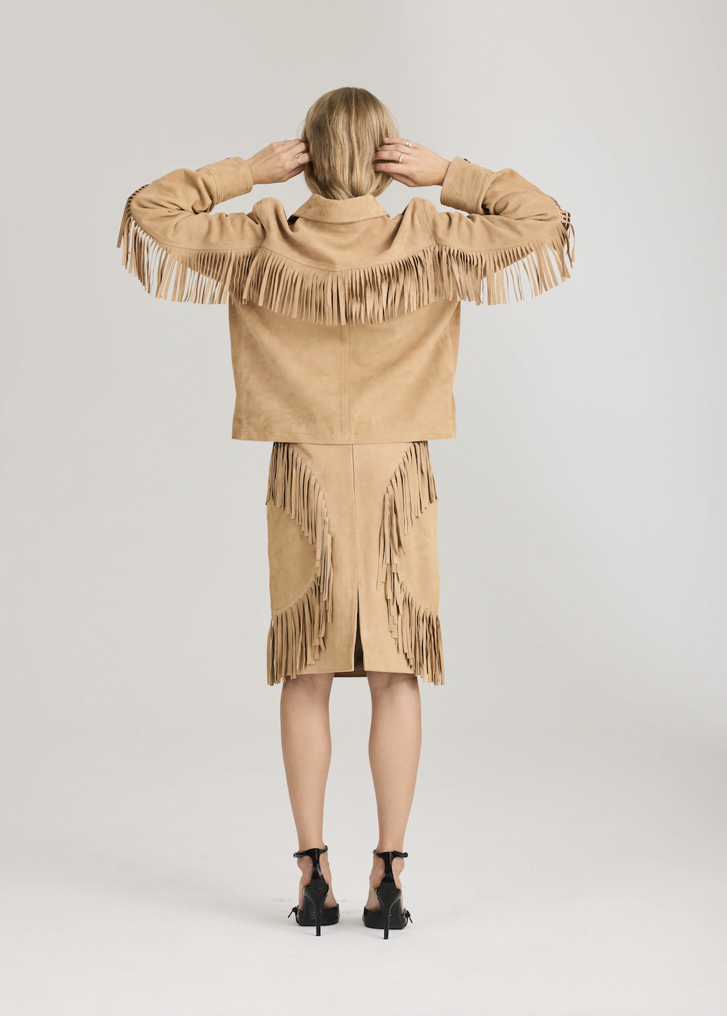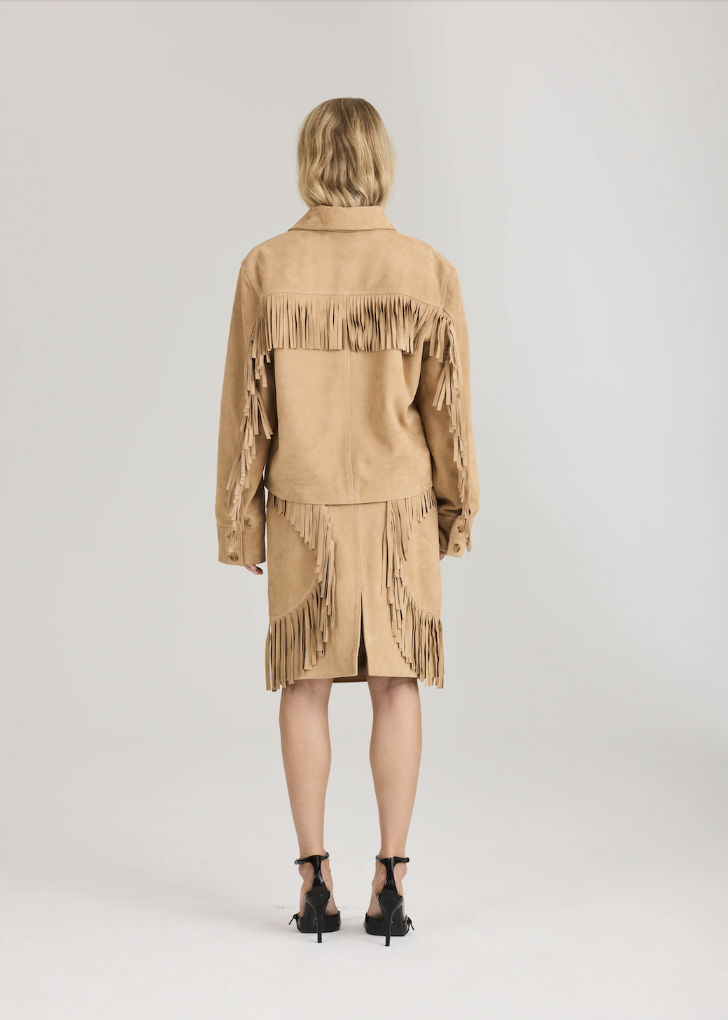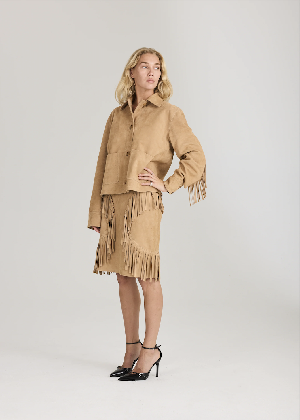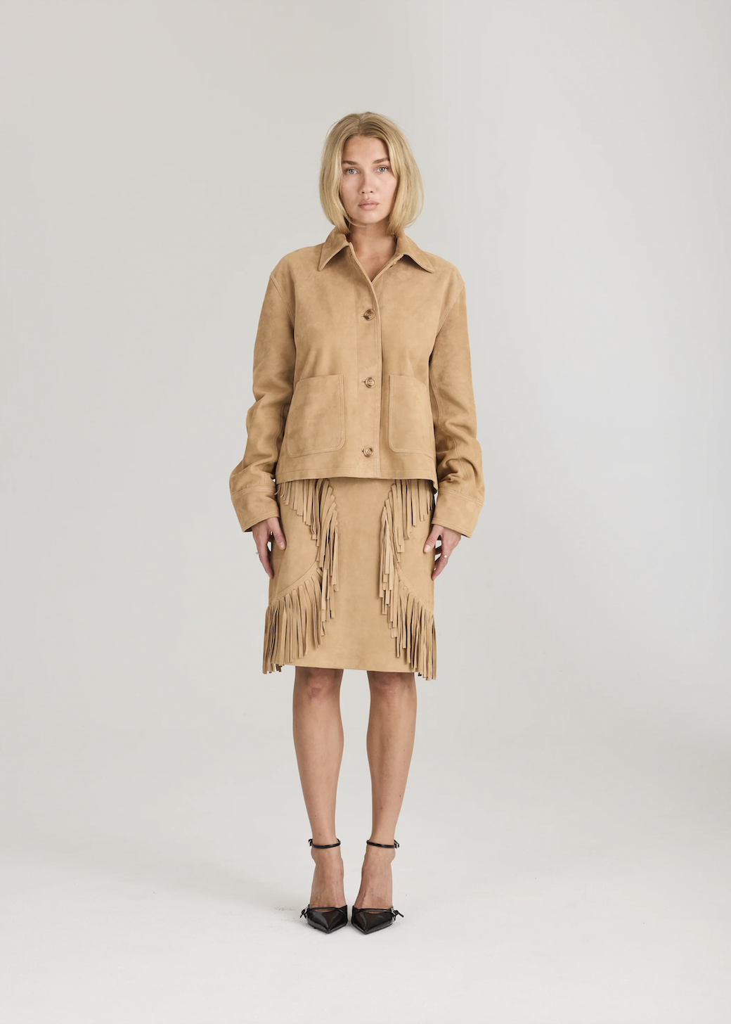 Bay Fringe Jacket. Bay Fringe Jacket fra Ravn Ravn er en statement-jakke i semsket skinn med myke frynsedetaljer og en avslappet silhuett. Designet for å tilføre tekstur og en raffinert bohemsk touch til både hverdagsantrekk og mer dressy anledninger.