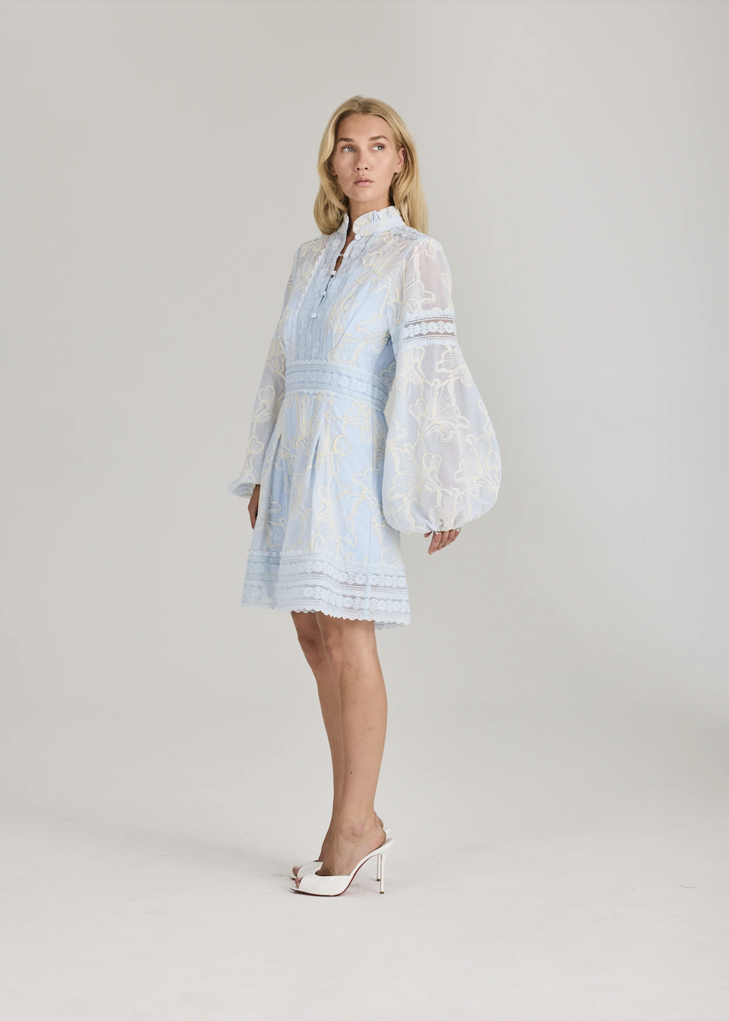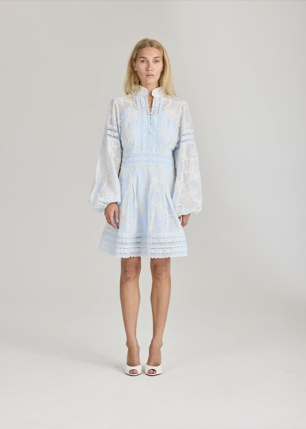 Aliah Needle Dress. Aliah Needle Dress fra Ravn Ravn er en lett og feminin kjole med en markert midje, voluminøse ermer og en flytende silhuett. Kjolen har nydelige blonde detaljer ogf broderier og en høy hals med knapper. Kjolen kommer med en myk underkjole. Enkel å style til hverdags, eller pynt opp med hæler til spesielle anledninger.