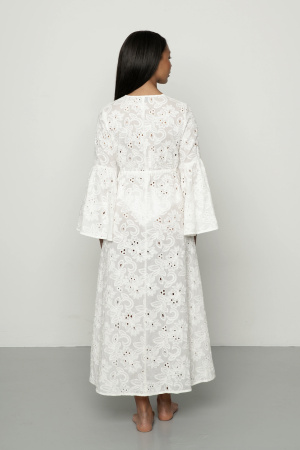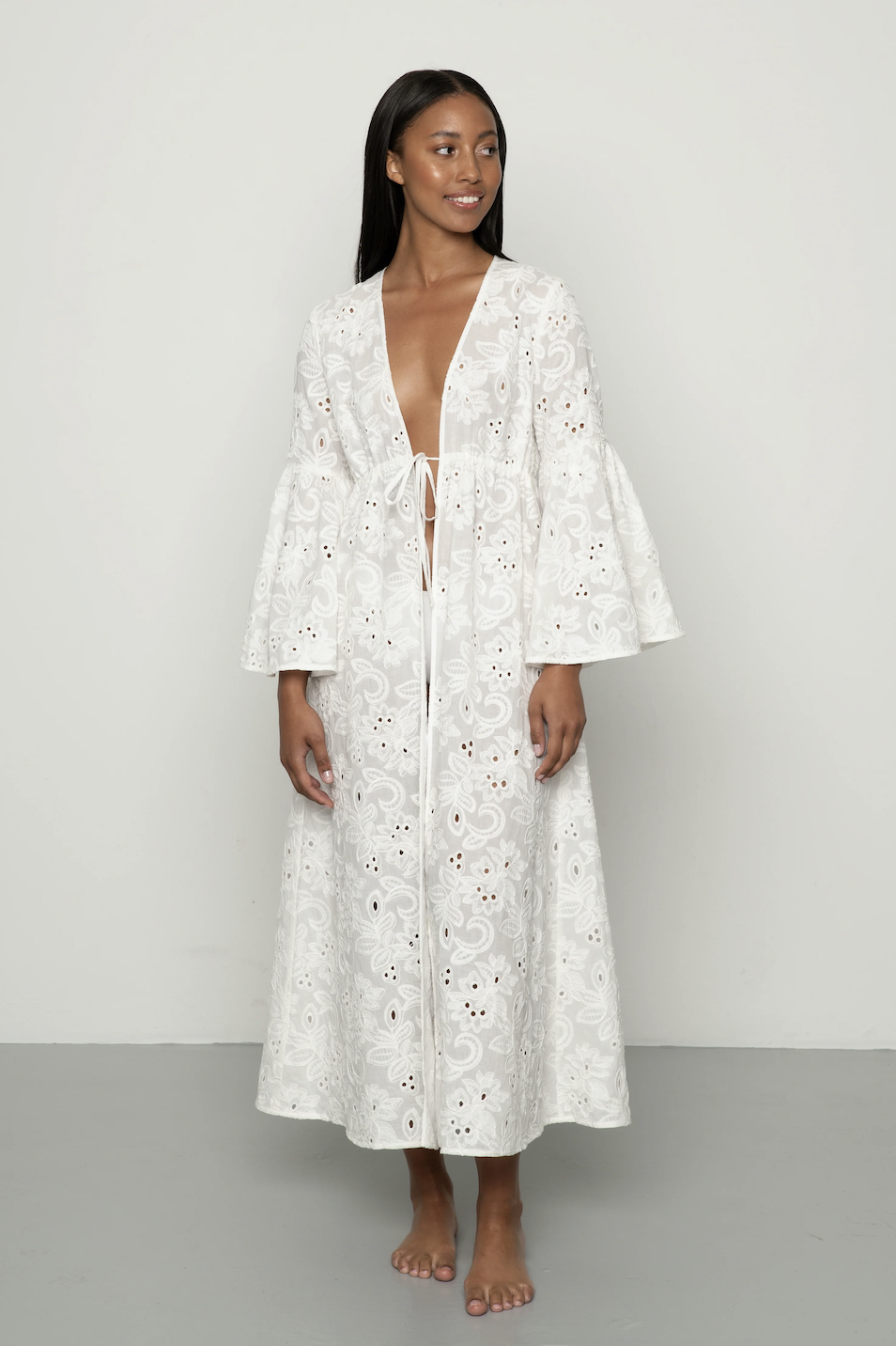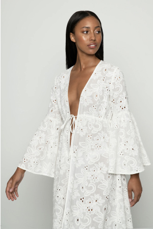 Med engelsk blonde fra topp til tå er Colette-kaftanen det ultimate plagget vi drømmer om. Med maxi-lengde, flatterende silhuett og utsvingede ermer er den et essensielt plagg til sommerens mange anledninger – og et must i feriegarderoben. Den har knyting i livet som gir den en justerbar passform.