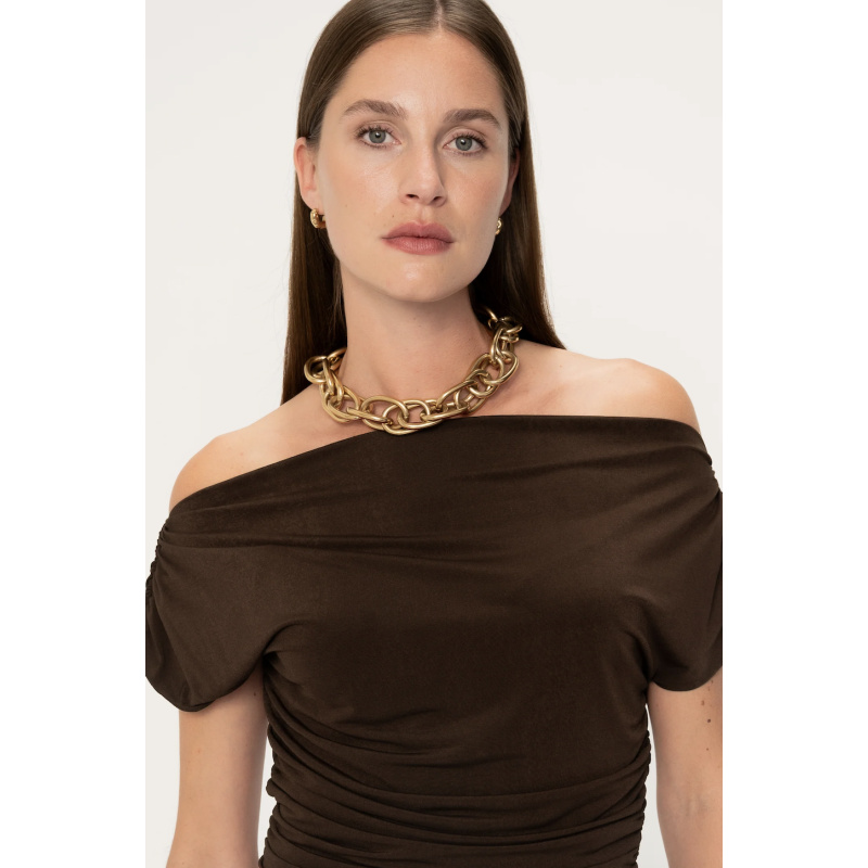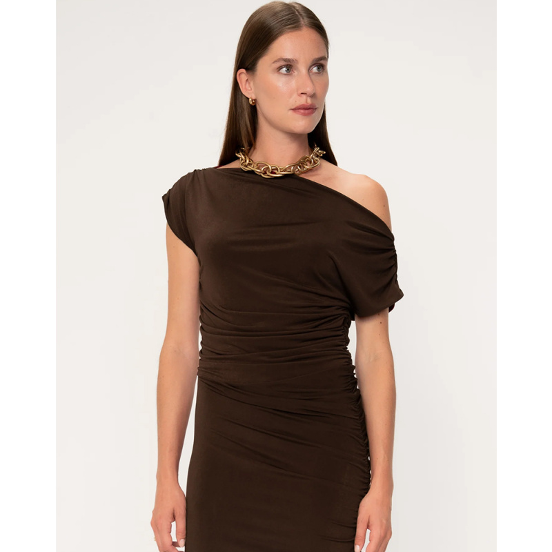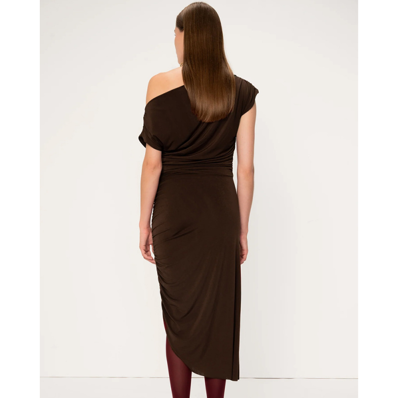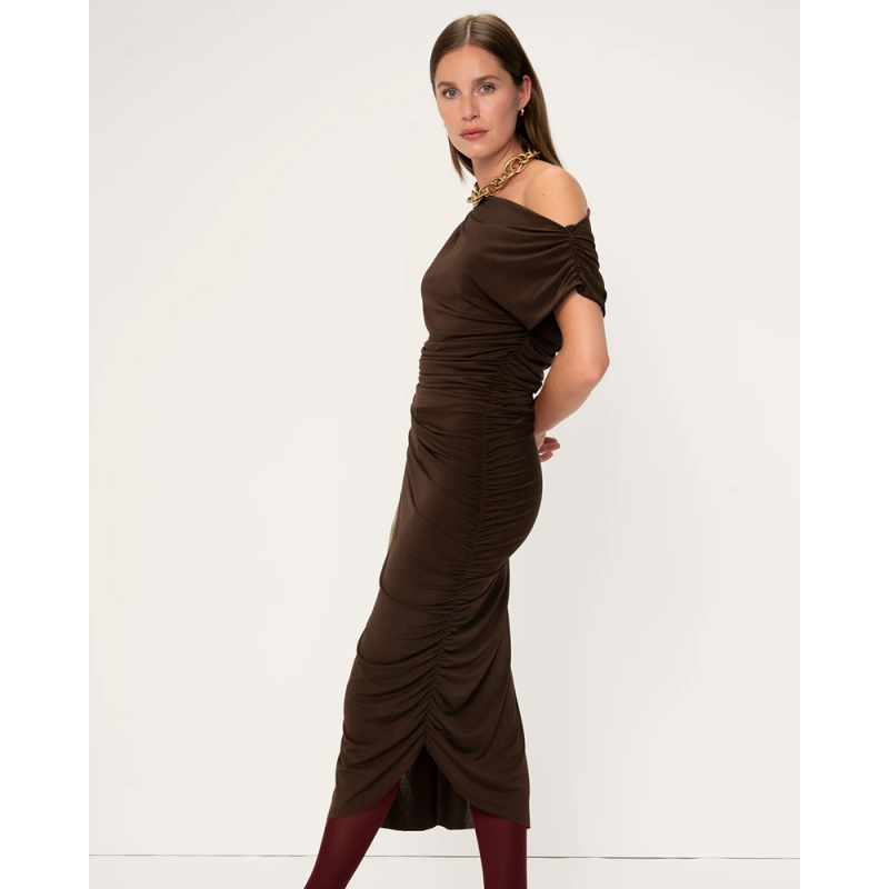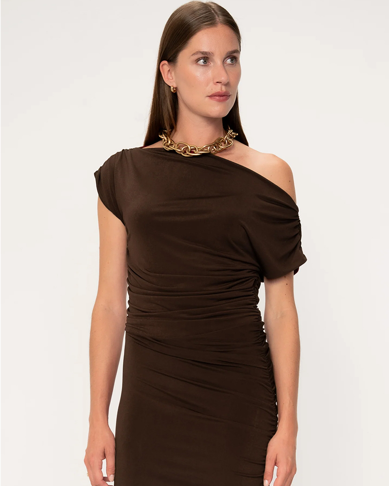 Columbine er en asymmetrisk maxikjole med tettsittende fasong. Rynkede skuldre og sidesømmer gir elegante draperinger langs hele kjolen. Den brede båthalsen gjør at man også kan bruke kjolen off-shoulder.