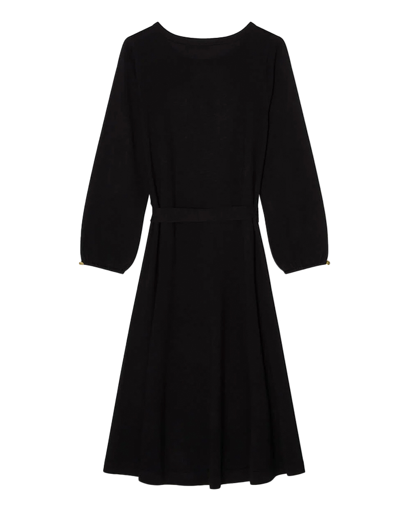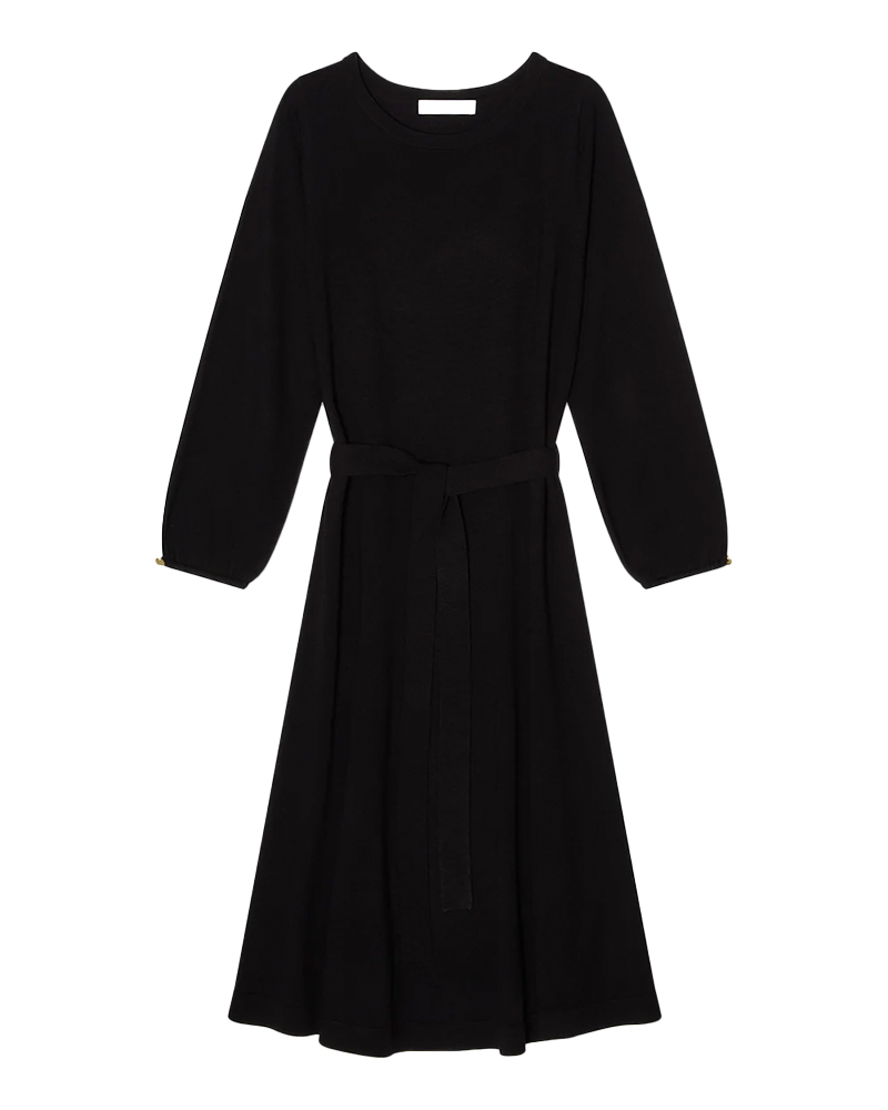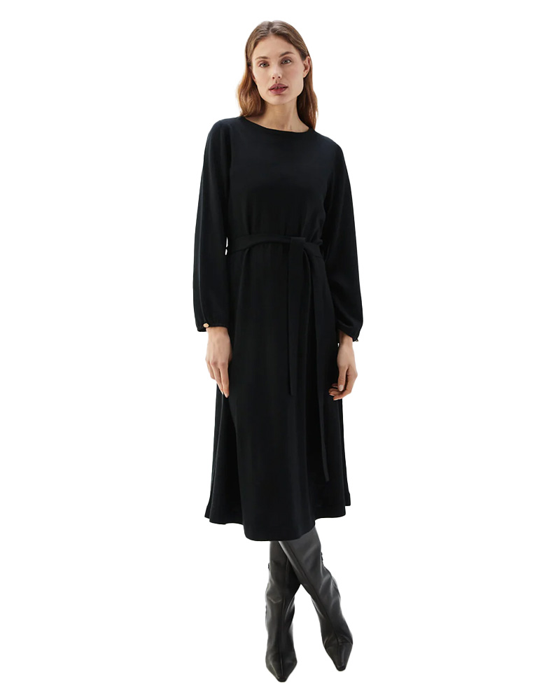 Eden Dress er en strikket midikjole med lange ermer, laget av myk merinoull. Denne komfortable og flatterende kjolen er designet med en A-linjeformet fasong, et klokkeformet erme og et belte i skallstoff i midjen.