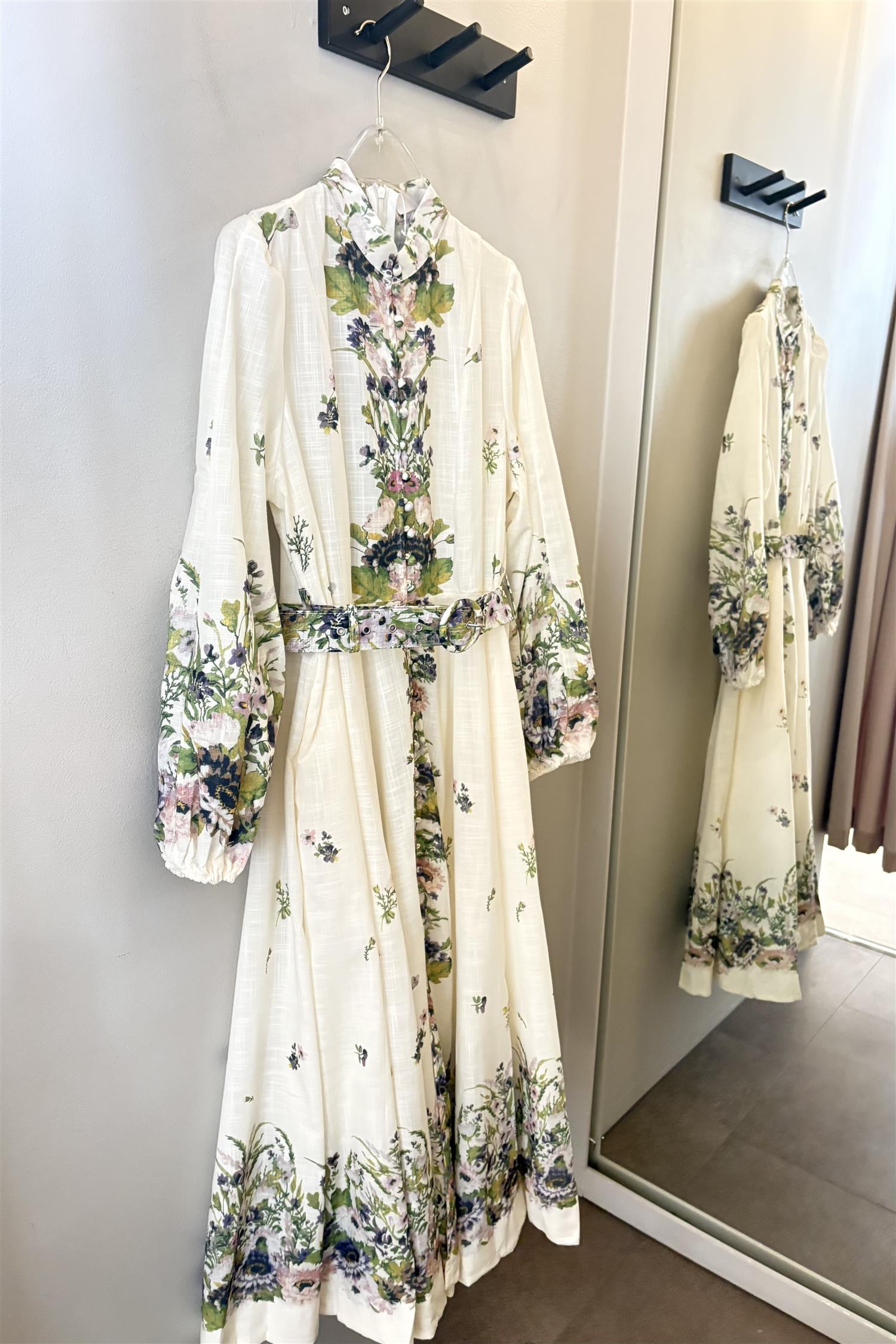 Vakker kjole fra FPWL med grønne og lilla/rosa blomster. Kjolen har voluminøse ermer, belte i midjen og små stofftrukne knapper langs hele fronten. Stikklommer i siden. Lukkes i ryggen med glidelås.
