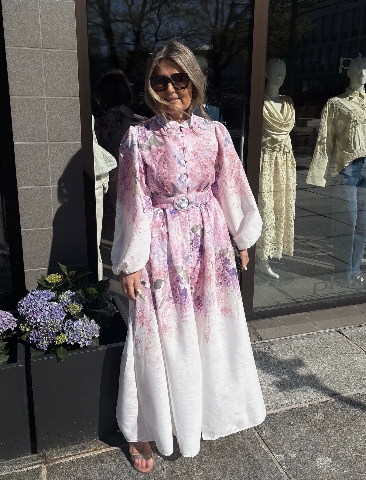 Vakker kjole fra FPWL med lilla og rosa blomster. Kjolen har voluminøse ermer, belte i midjen og små stofftrukne knapper langs hele fronten. Stikklommer i siden.