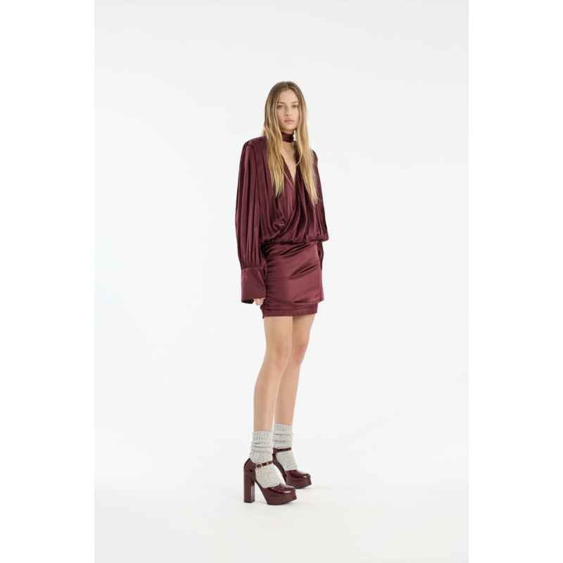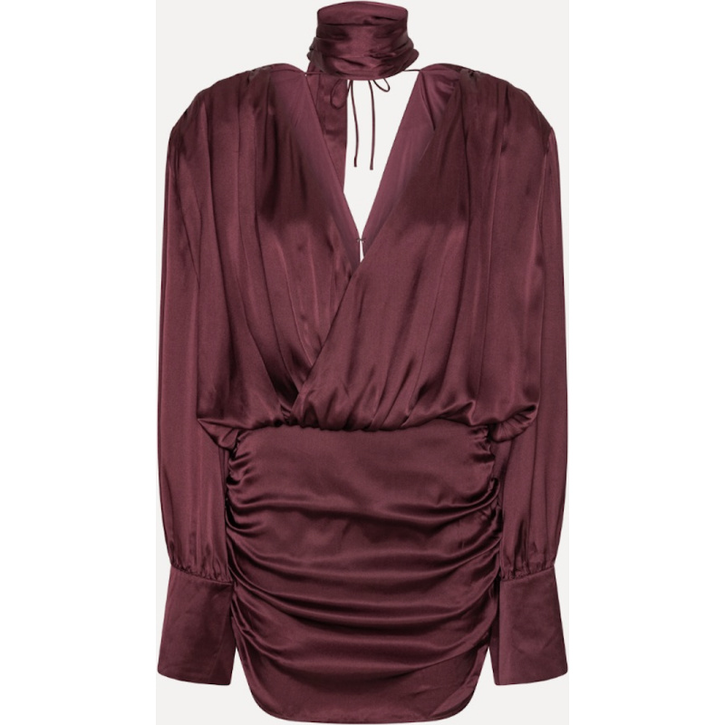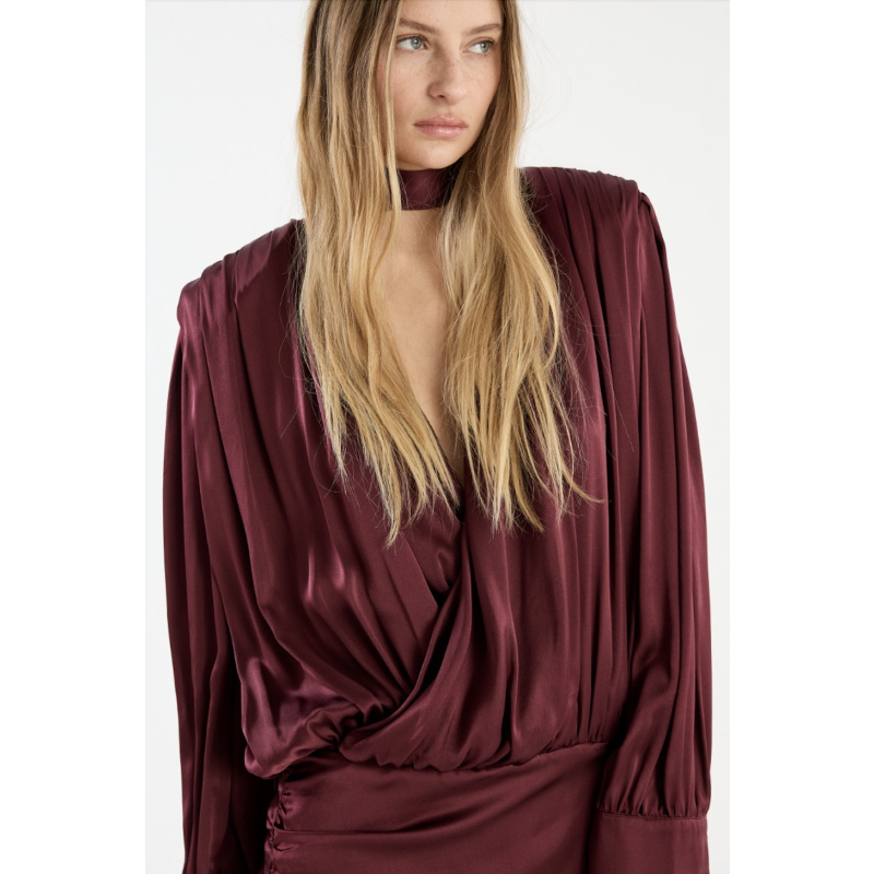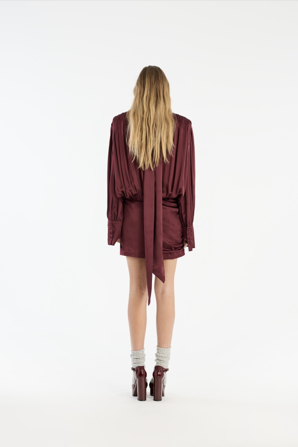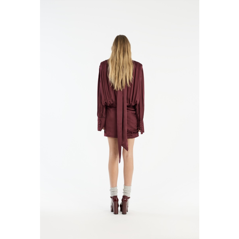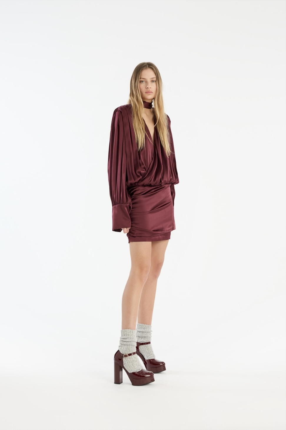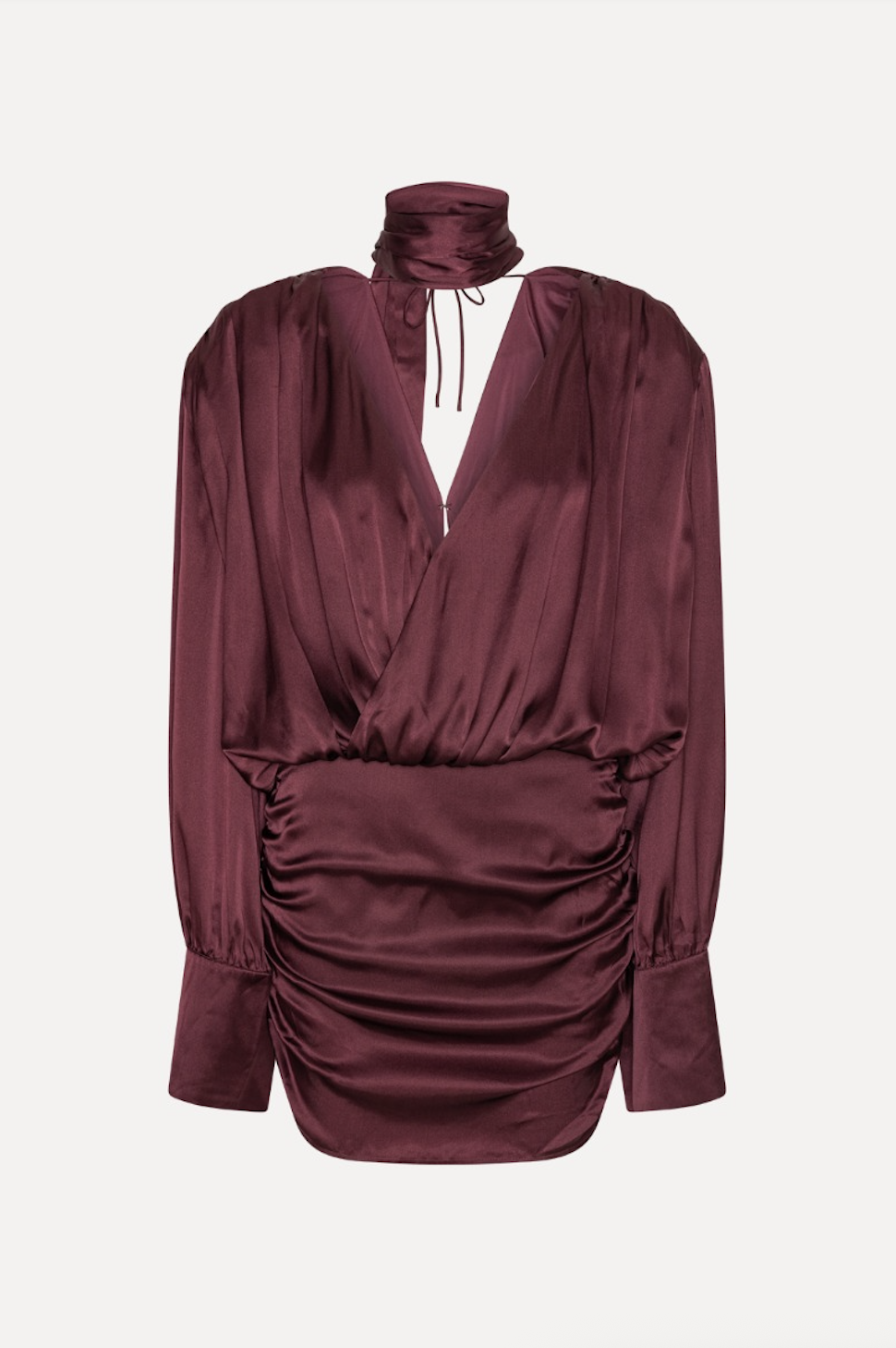 LS Silk V-neck Dress fra Rotate er en elegant minikjole i silke med dyp V-utringning både foran og bak. Overdelen er mykt drapert med plissert skulderparti og et festet skjerf-detalj. Kjolen har lange ermer, markert midje og en rynket miniskjørt med asymmetrisk kant. Skjult glidelåslukking bak.