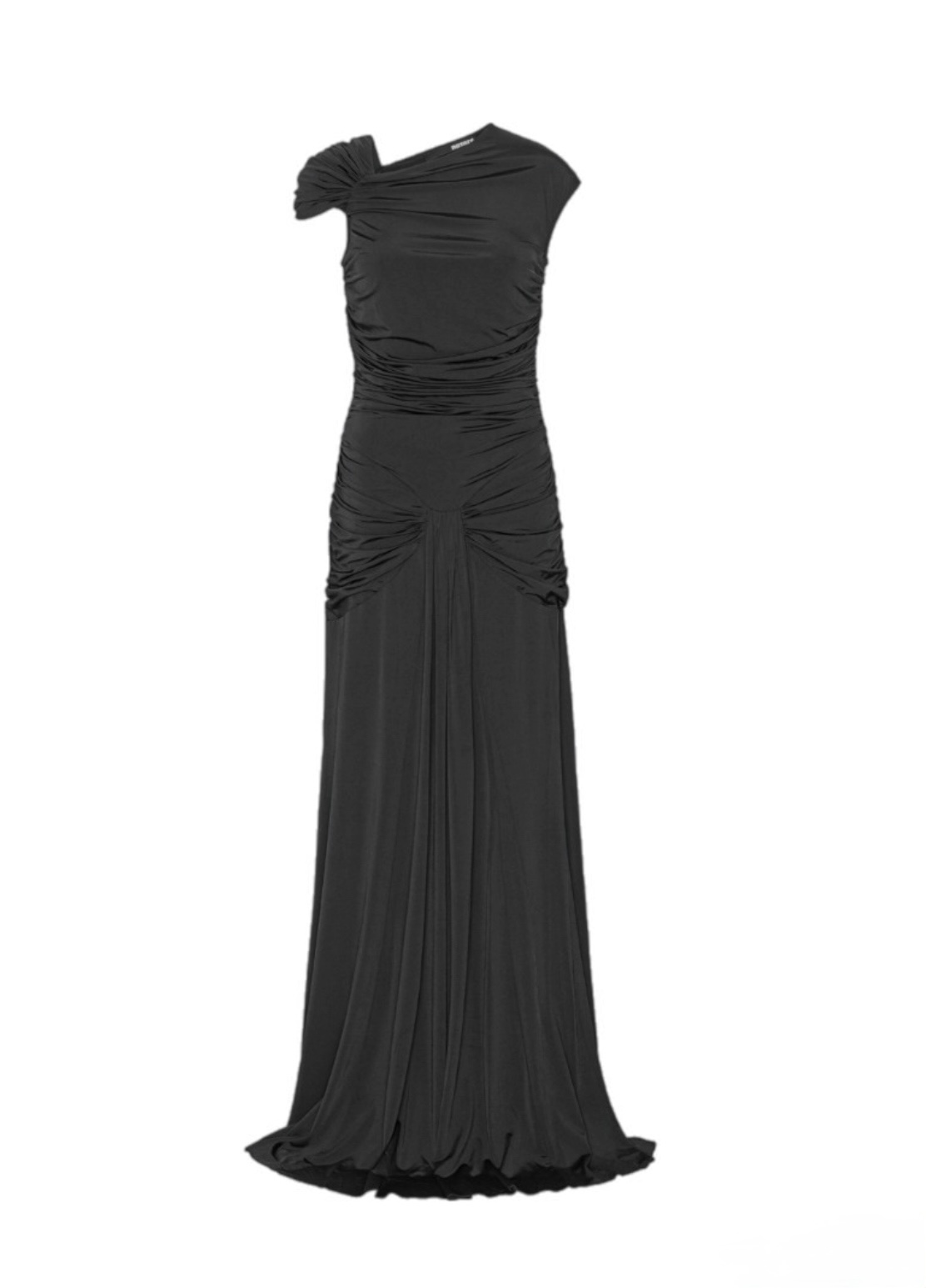 Maxi Asymmetric Dress fra Rotate. Maxi Asymmetric Dress er en maxikjole med asymmetrisk snitt og elegante draperinger. Kjolen har én skulder med rynkedetalj og figurnær passform som fremhever silhuetten, mens det myke stoffet faller vakkert ned i et flowy skjørt.