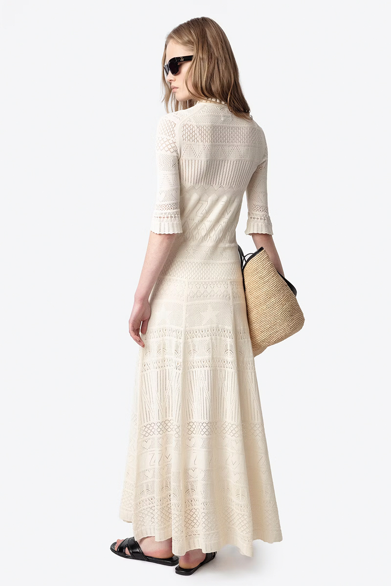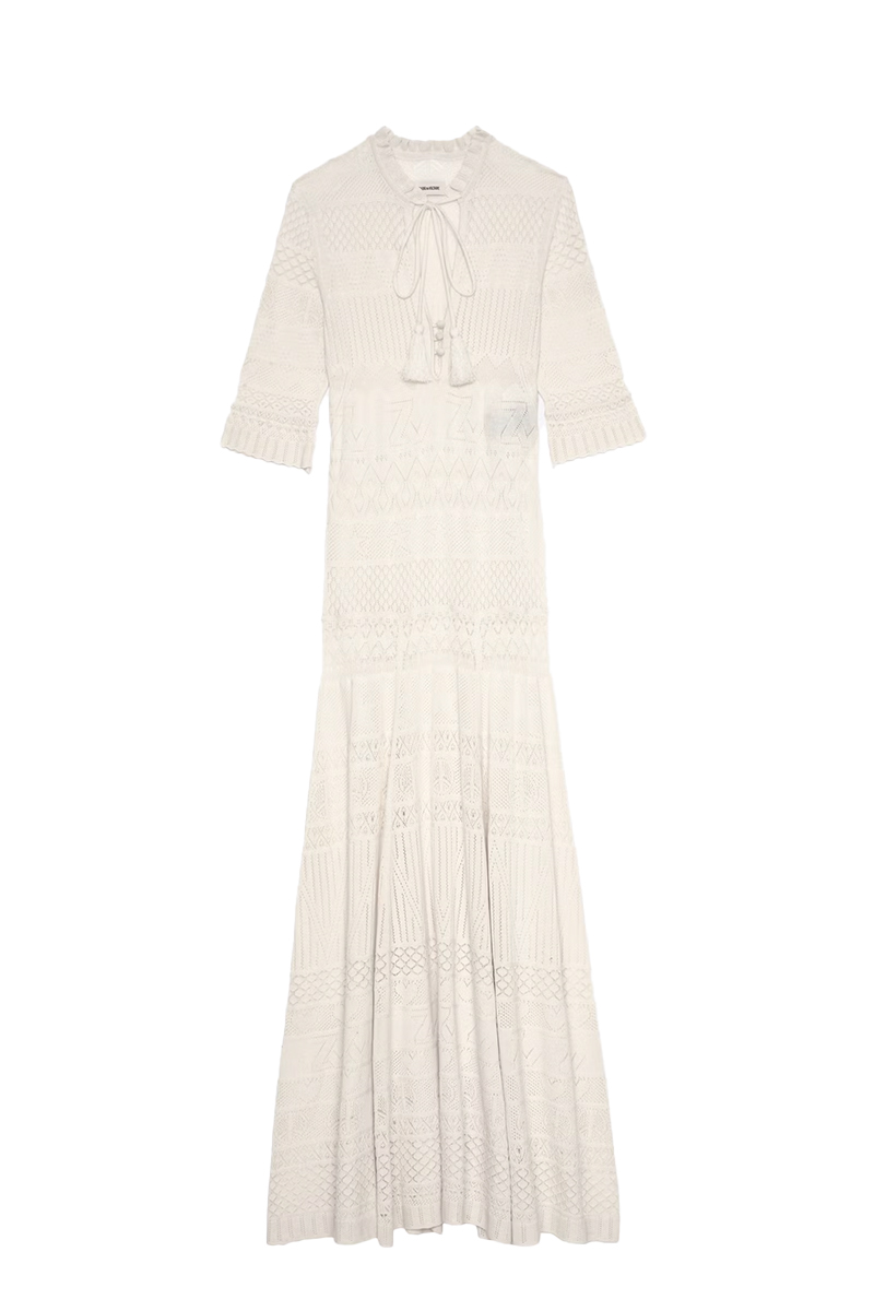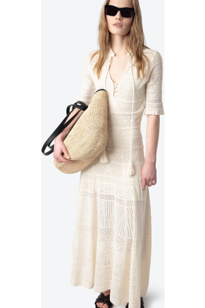 Kjole i mykt ribbestrikket stoff. Den har en rund hals, og går ned til anklene med en splitt på venstre