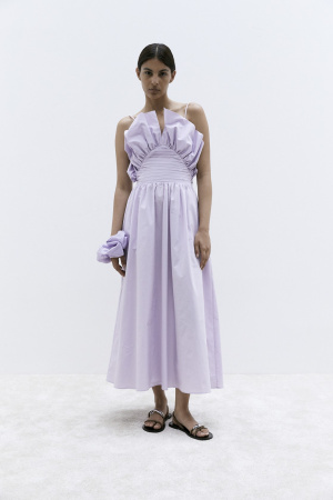 Columbine er en asymmetrisk maxikjole med tettsittende fasong. Rynkede skuldre og sidesømmer gir elegante draperinger langs hele kjolen. Den brede