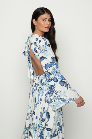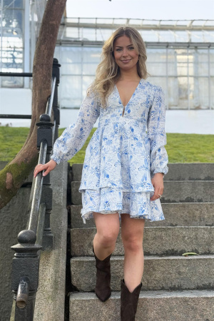 Hele ermer og et lagdelt skjørt mellom legglengden gir denne kjolen en vakker silhuett, mens den høye kragen og knytebeltet gir en følelse av elegant. Det overdimensjonerte blomstertrykket er et pust av ren sommer.
