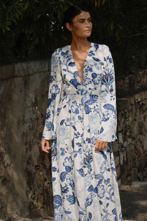 Maxikjole fra Dea Kudibal. Denne kjolen har volumiøse ermer og et utsvingt, lagdelt skjørt. Kan strammes i livet ned et