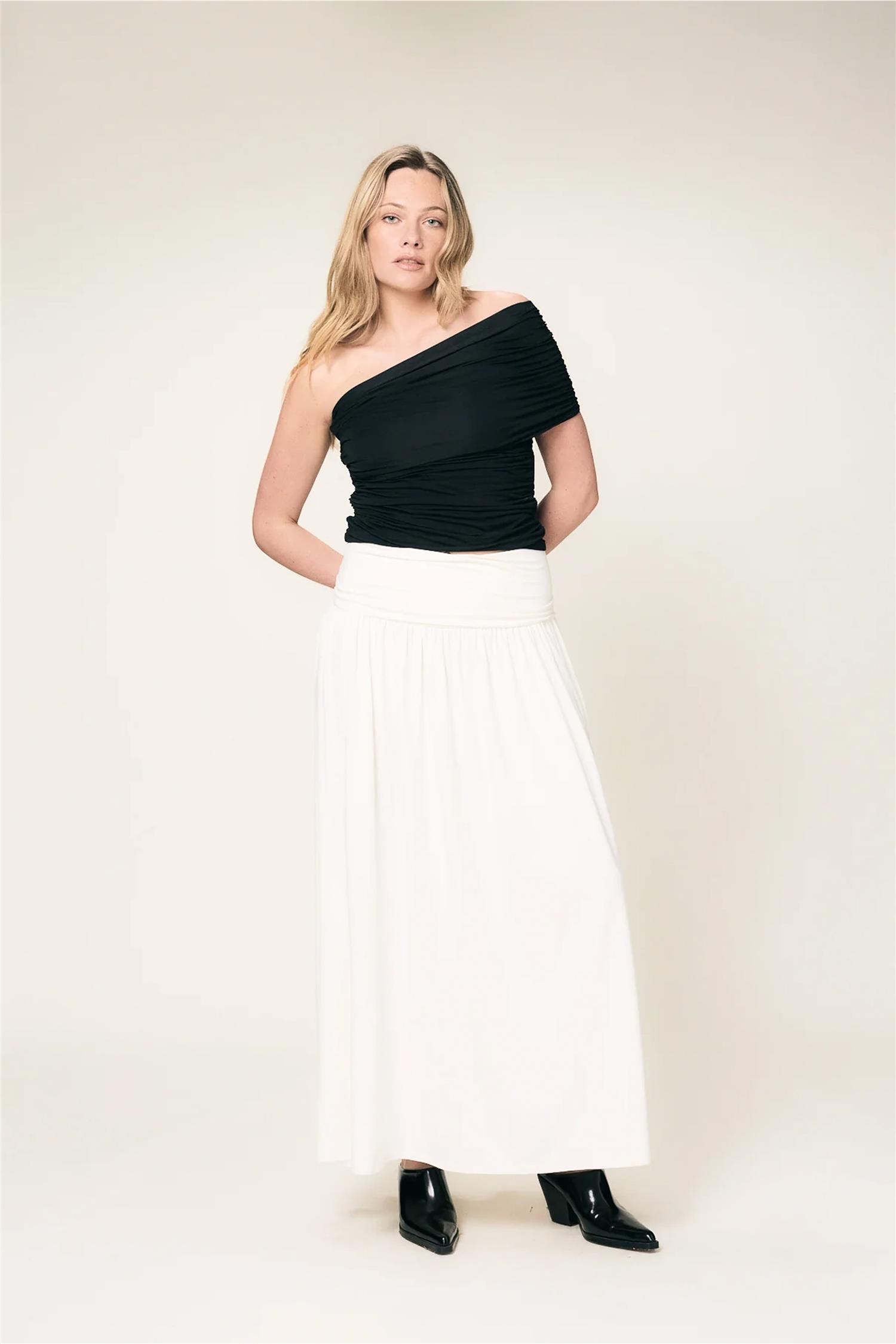 VIVEH Petunia er et maxi-skjørt som har en tilpasset linning som kan brukes sammenfoldet eller utfoldet, og tilbyr allsidige stylingsalternativer. Bruk det som et skjørt med lavt midje, middels midje eller høyt midje, eller trekk det over brystet for å forvandle det til en kjole. Laget av vår signatur ECOVERO™ viskosejersey-stoff, gir den en komfortabel, fast passform som klemmer kroppen og drapererer elegant.