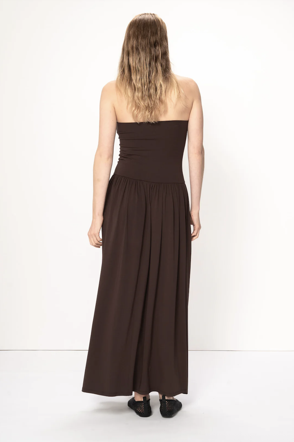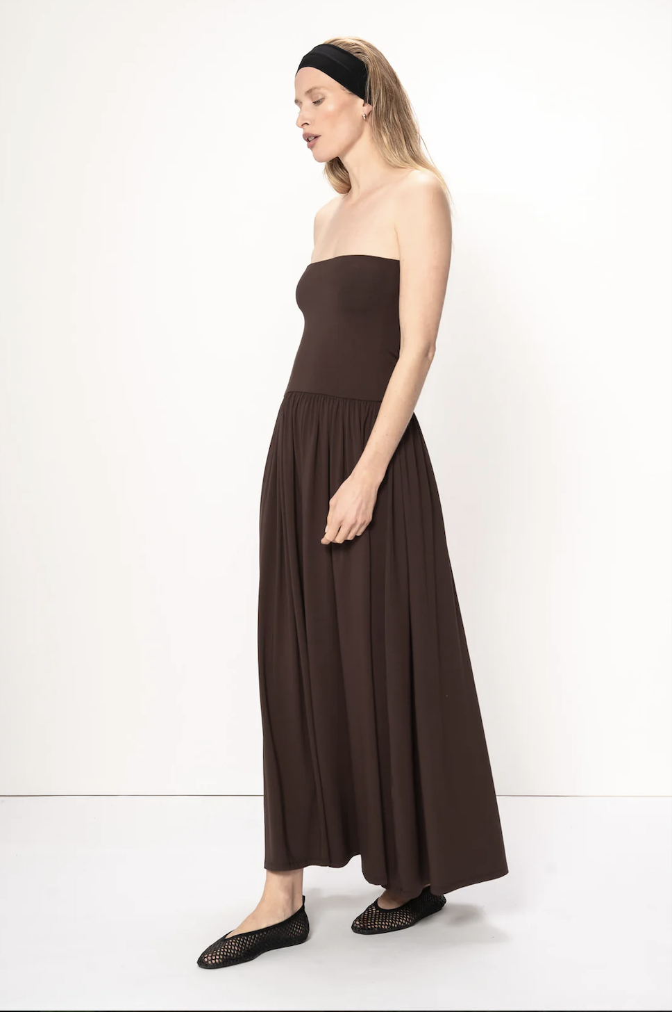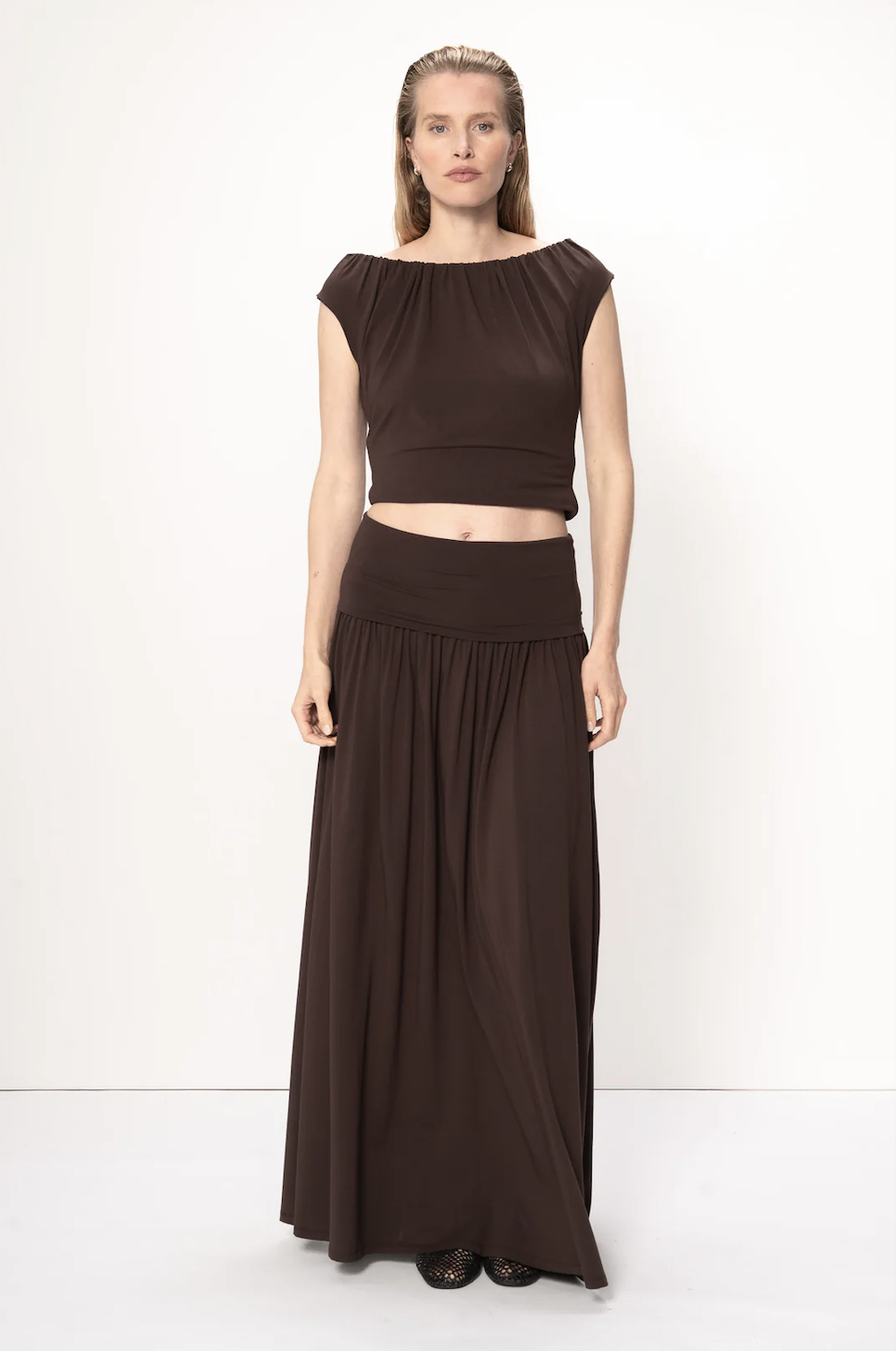 Petunia fra Vivehe er et multifunksjonelt maxiskjørt laget i VIVEHs signaturmateriale ECOVERO™ viskosejersey. Designet med en bred, tettsittende linning som former silhuetten og gjør at skjørtet kan bæres lavt, midt eller høyt på livet eller styles som en kjole for et allsidig uttrykk fra dag til kveld.