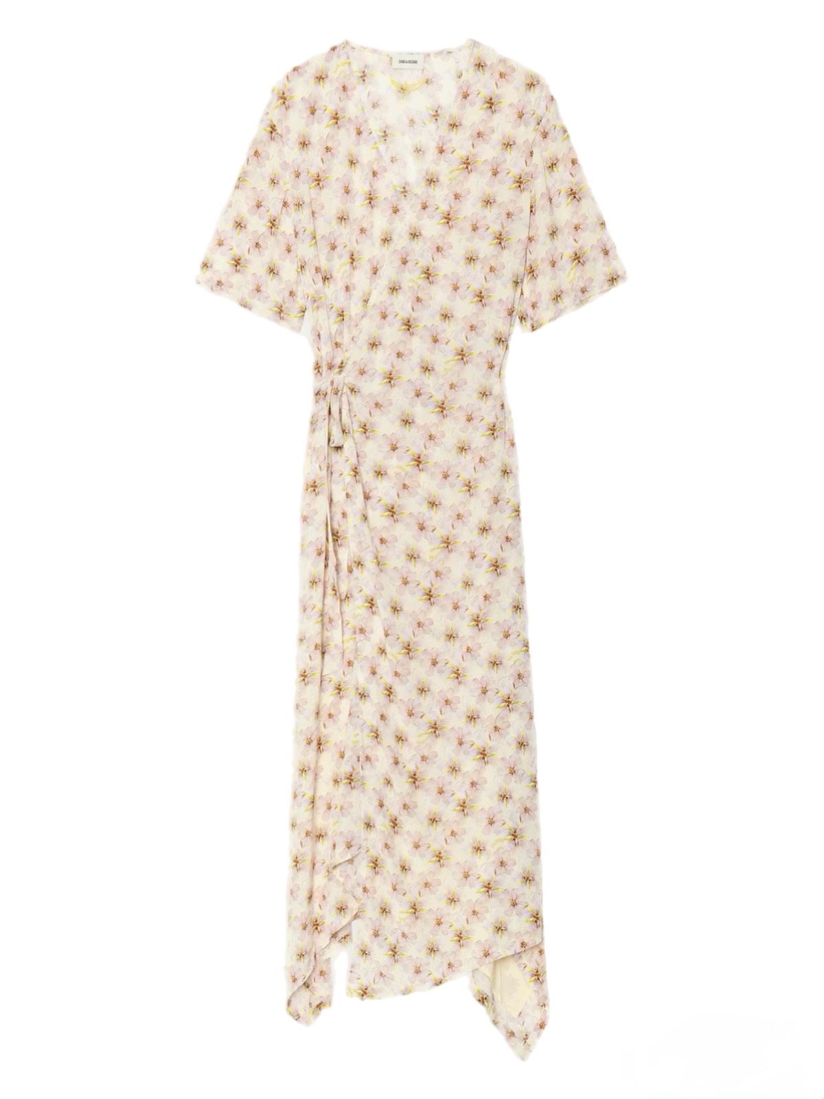 Reforme Smooth Mirror Flowers. Reforme Smooth Mirror Flowers fra Zadig & Voltaire er en wrapkjole i midi-lengde. Kjolen har korte ermer, dyp utringning, med asymmetrisk kant. Et delikat blomstermønster i lysegult, fersken og rosa pryder kjolen.