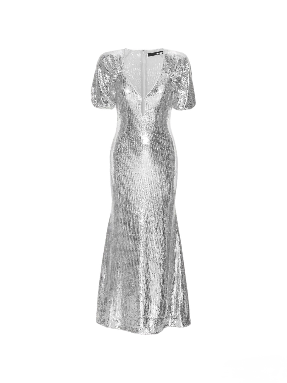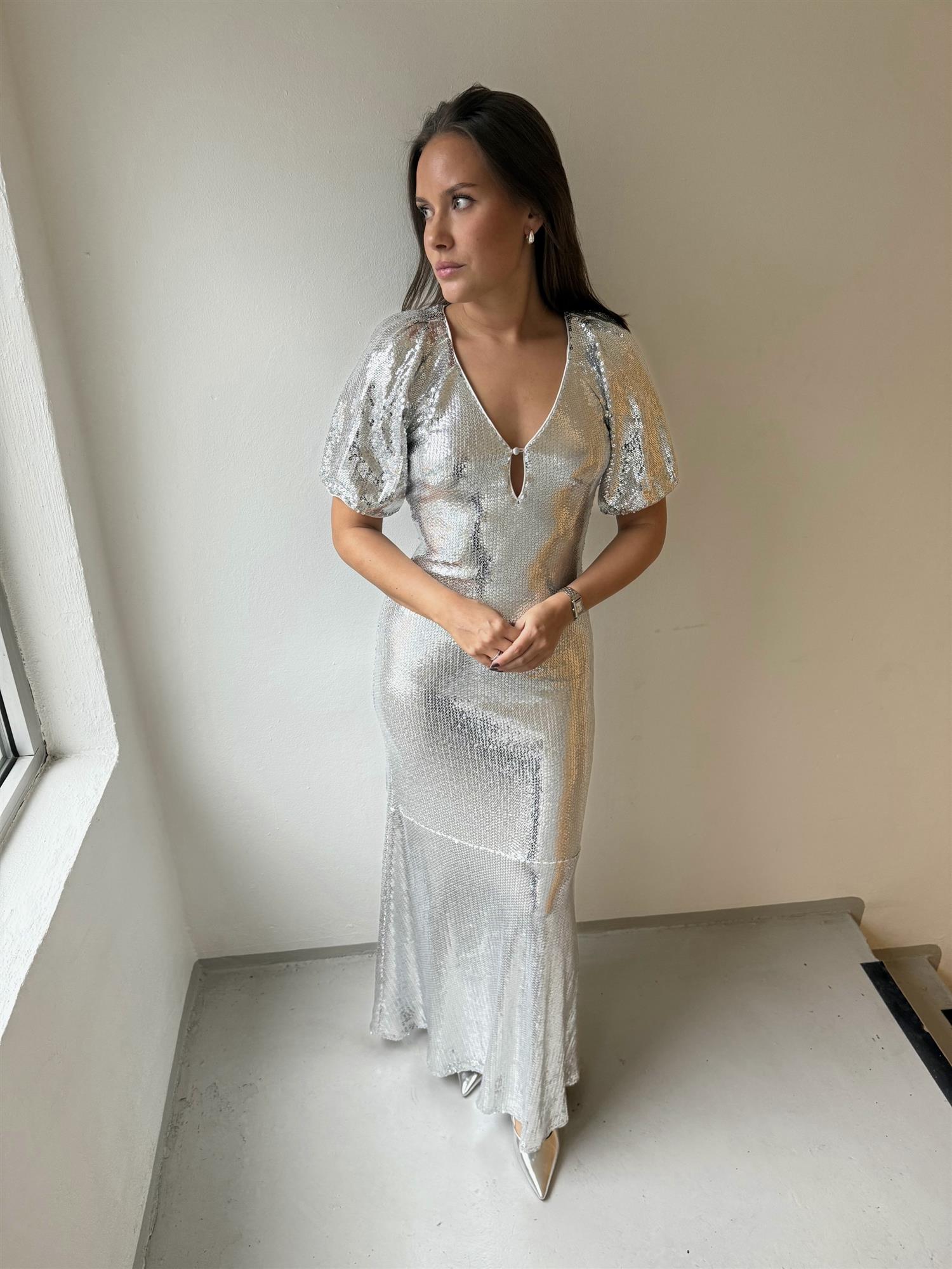 Sequin Midi Dress fra Rotate. Sequon Midi Dress er en vakker paljettkjole i sølv. Den har dyp utringing, korte ermer og en smal passform med et utsvingt skjørt. Lukkes i ryggen med en glidelås.