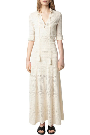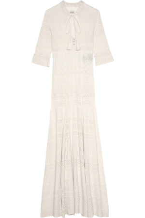 – Lang kjole i bomull – Pointelle-mønstre og rillede ribbekanter – Knappet halskant med duskbånd – Korte ermer – Utvidet