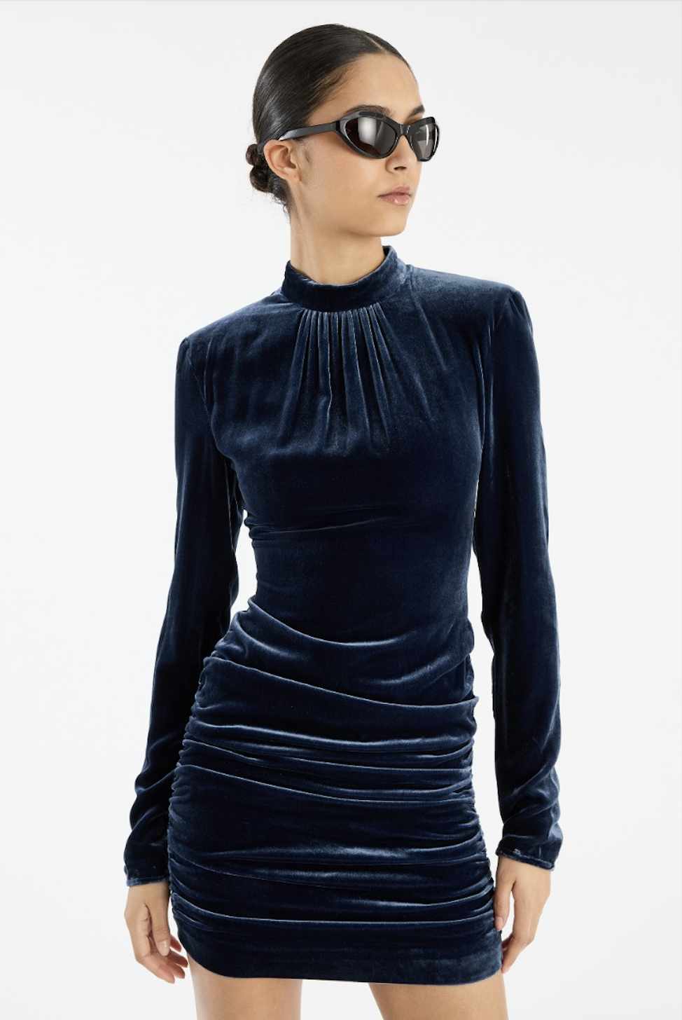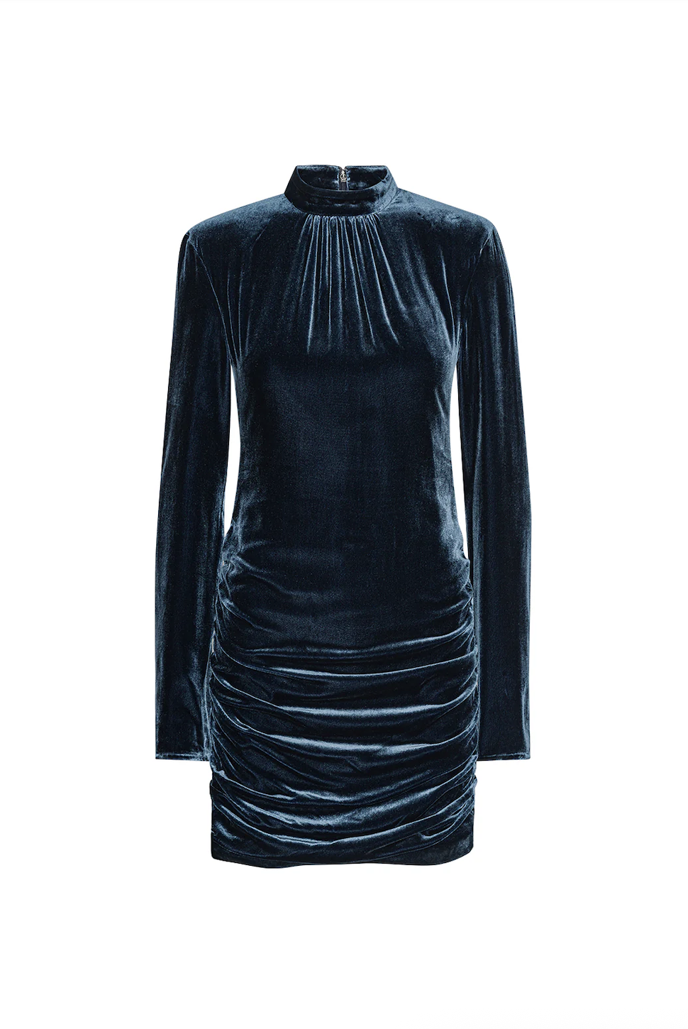 Silk Velvet LS Mini Dress fra Rotate er en elegant minikjole i myk fløyel med lange ermer og høy hals. Kjolen har lett skulderstruktur og fine folder foran i halsen. Den kroppsnære silhuetten fremheves av flatterende rynking i sidene og en skjult glidelås bak.