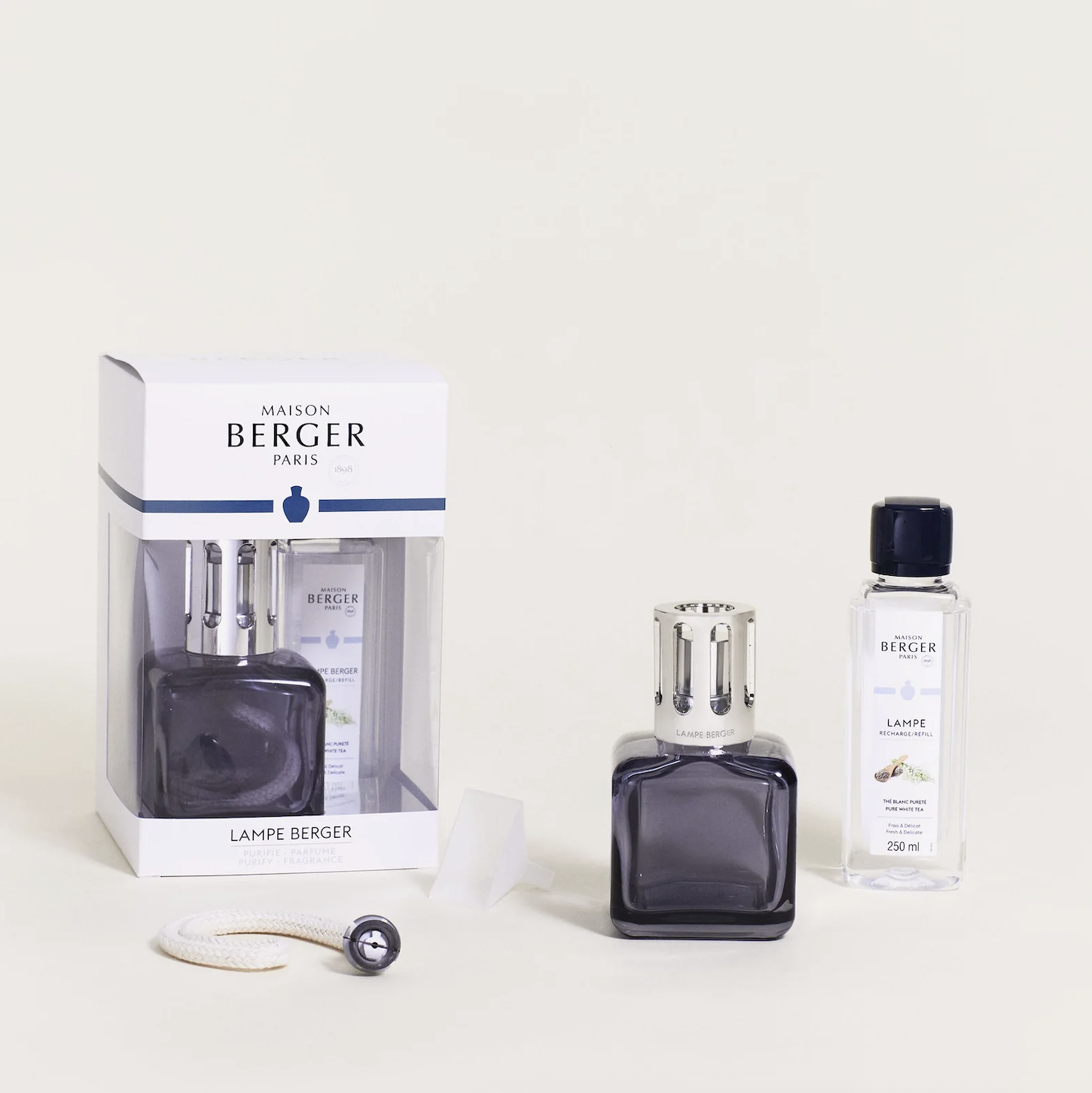 Lampe Glacon Kit fra Maison Berger. Kombiner modernitet og mildhet med Lampe Glacon Berger. Dens kubiske form med avrundede kanter inviterer til avslapning, mens de subtile duftene av Pure White Tea sprer seg i rommet. Sitronaktige toner av bergamot blandes med hvit te og den fengslende duften av hvit musk.
