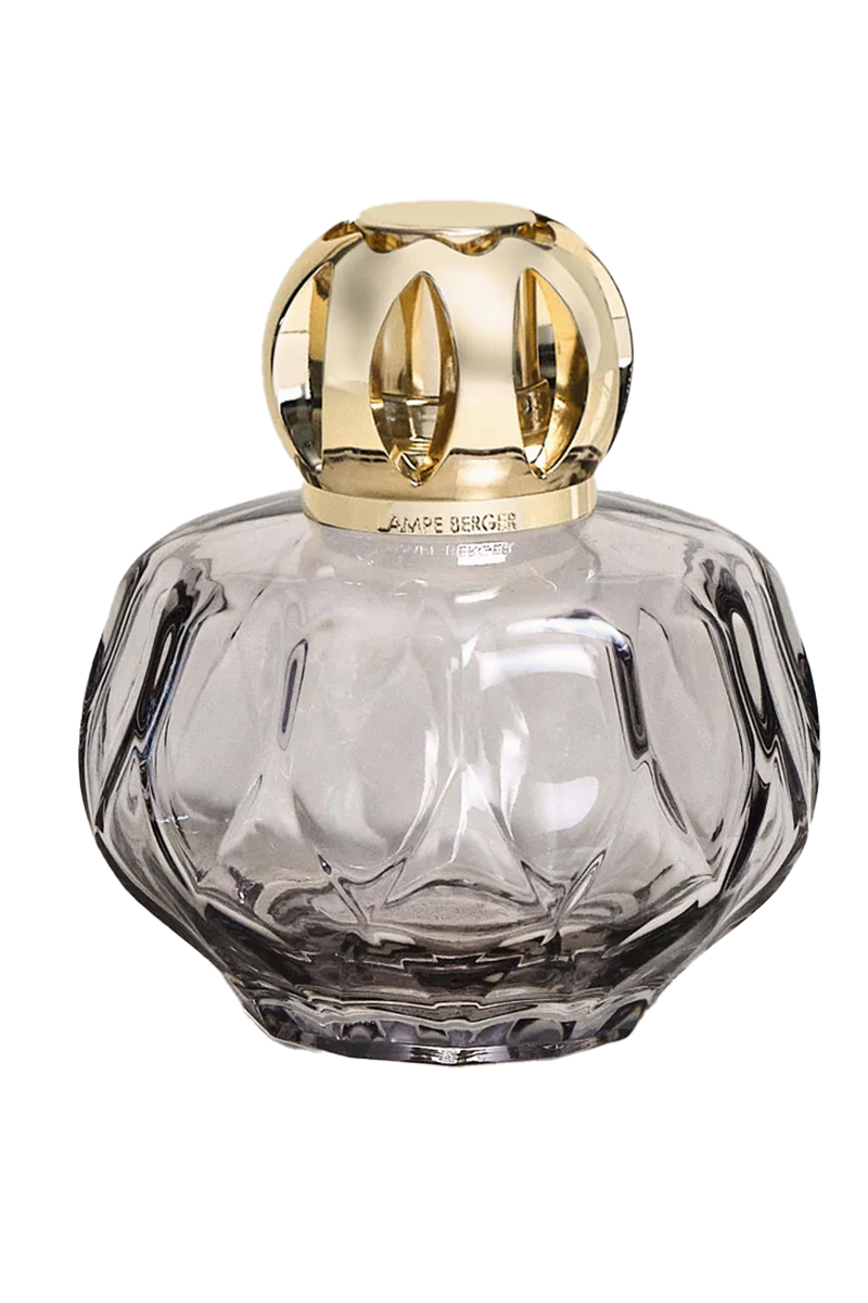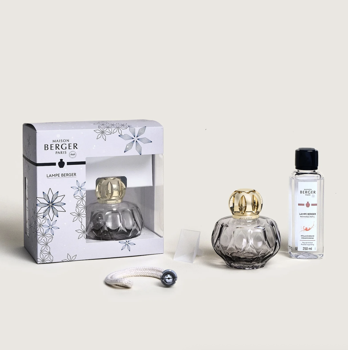 Rosalie Lamp fra Maison Berger. Oppdag Rosalie Lamp Kit, der elegant design møter delikat duft. Den origami-inspirerte lampen i grått lakkert glass gir et moderne og stilrent uttrykk, mens den medfølgende duften Exquisite Sparkle tilfører en frisk og luksuriøs atmosfære til hjemmet ditt.