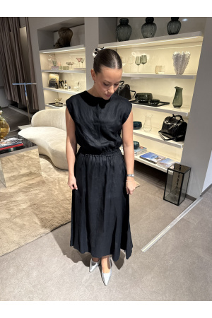 Linkjole fra italienske Meimeij. Kjolen har rund hals og korte ermer og lukkes i front med skjulte knapper. Strikk i