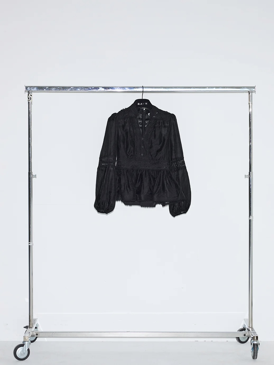 Aliah Stone Blouse fra RAVN RAVN. Elegant sort buse med romantiske blondedetaljer som gir en feminin og sofistikert look. Blusen har v-hals med knapper, høy krage, voluminøse ballongermer og en markert midje med lett peplum som fremhever figuren. Sorte steiner tilfører det lille ekstra til blusen.