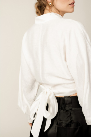 VIVEH Clover-blusen er en løstsittende design med en halvbeskåret silhuett og brede, voluminøse ermer, inspirert av VIVEH Viola-blusen, men nå laget av et lett, flytende teksturert stoff. Den har en knappelukking foran og en knytelukking i midjen for en justerbar passform.