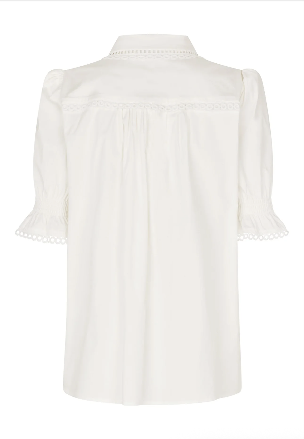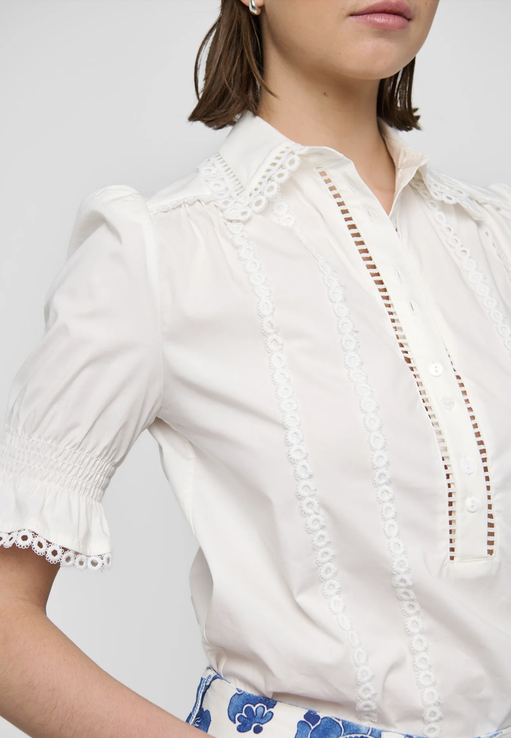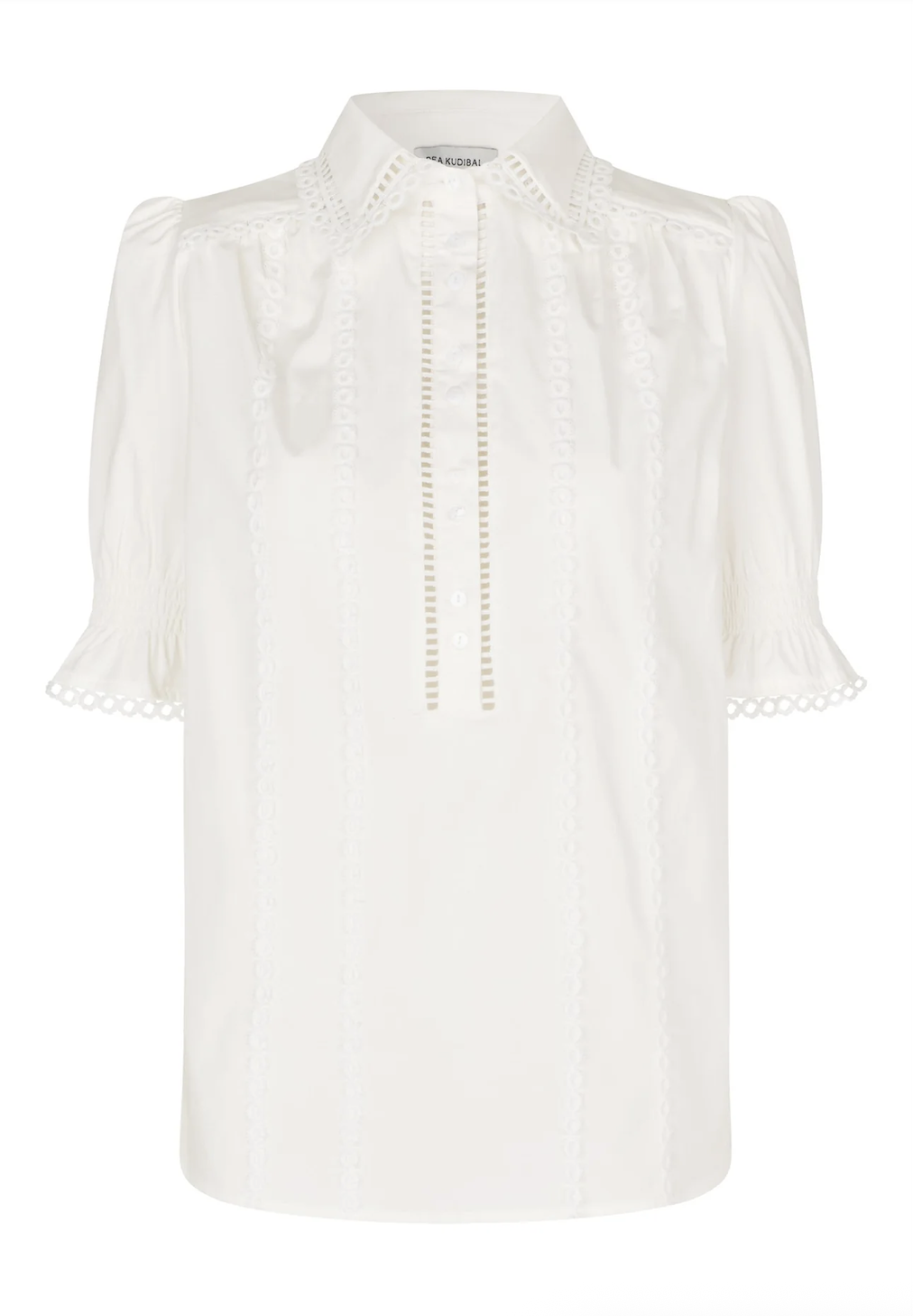 Dara Blouse. Dara Blouse fra Dea Kudibal er en feminin kortermet bluse i bomullspoplin. Blusen har delikate blondedetaljer og korte ermer med lett puff. Bruk den med jeans for et avslappet uttrykk, eller style den med skjørt for kveld ute.
