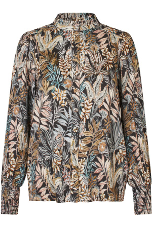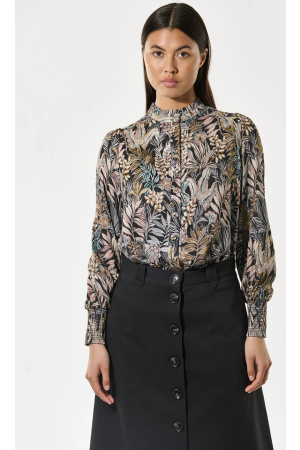 Bluse i viskosekrepp med bladprint fra Dea Kudibal. Ståkrage med volanger og stretchy smock-mansjetter. Materiale: 97% viskose, 3% elastan