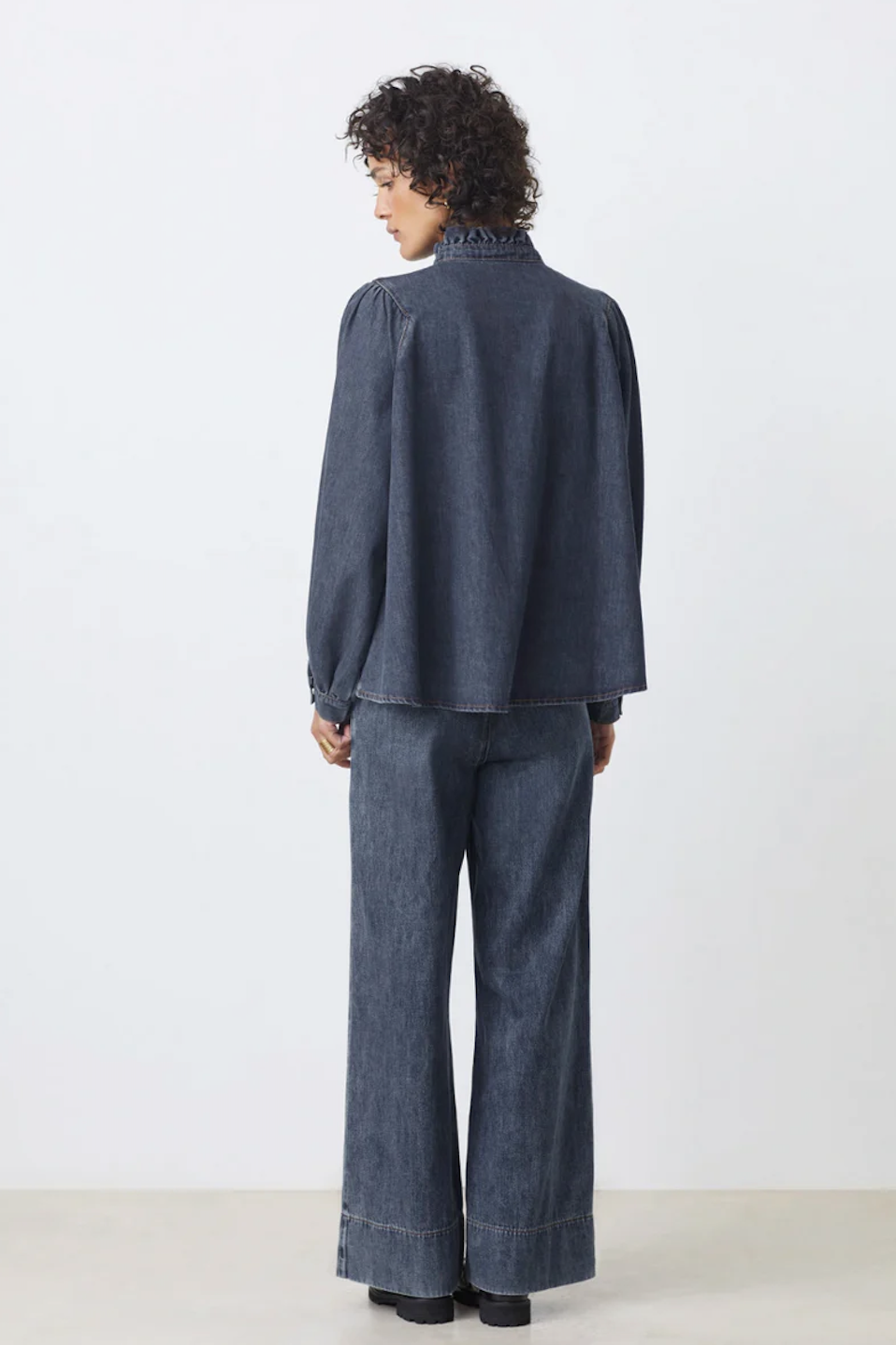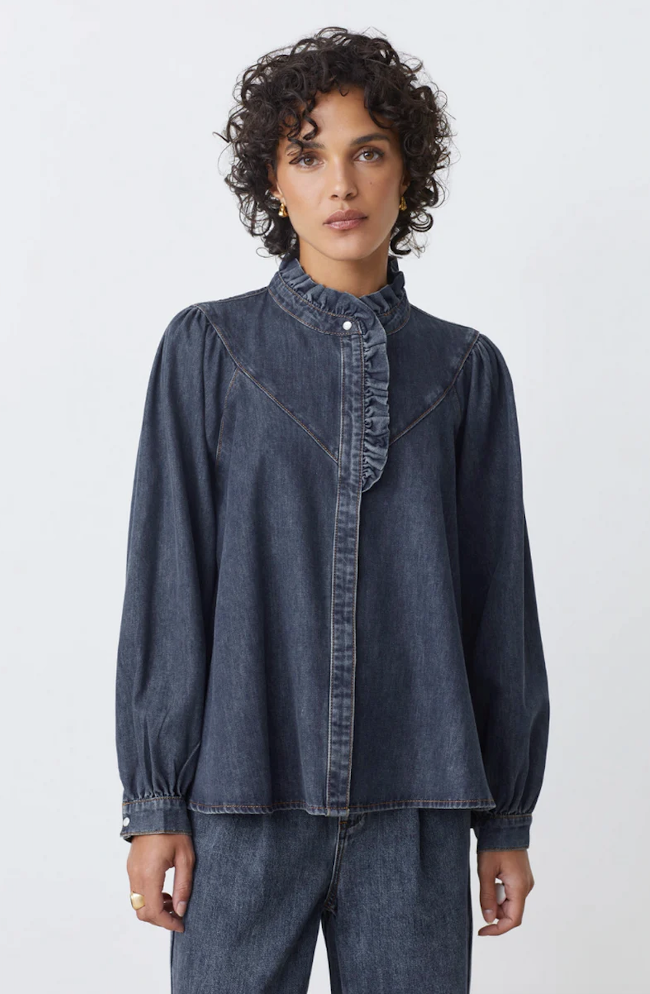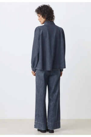 Denimbluse fra Suncoo. Løs passform med rysjedetaljer og puffermer. Blusen har lange ermer med knapp på mansjettene.