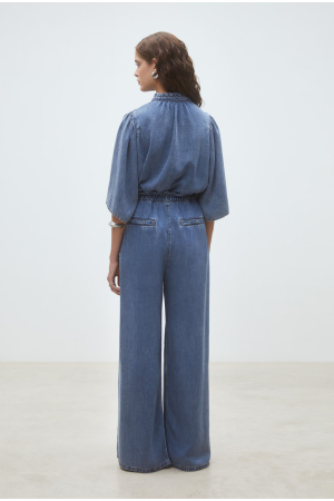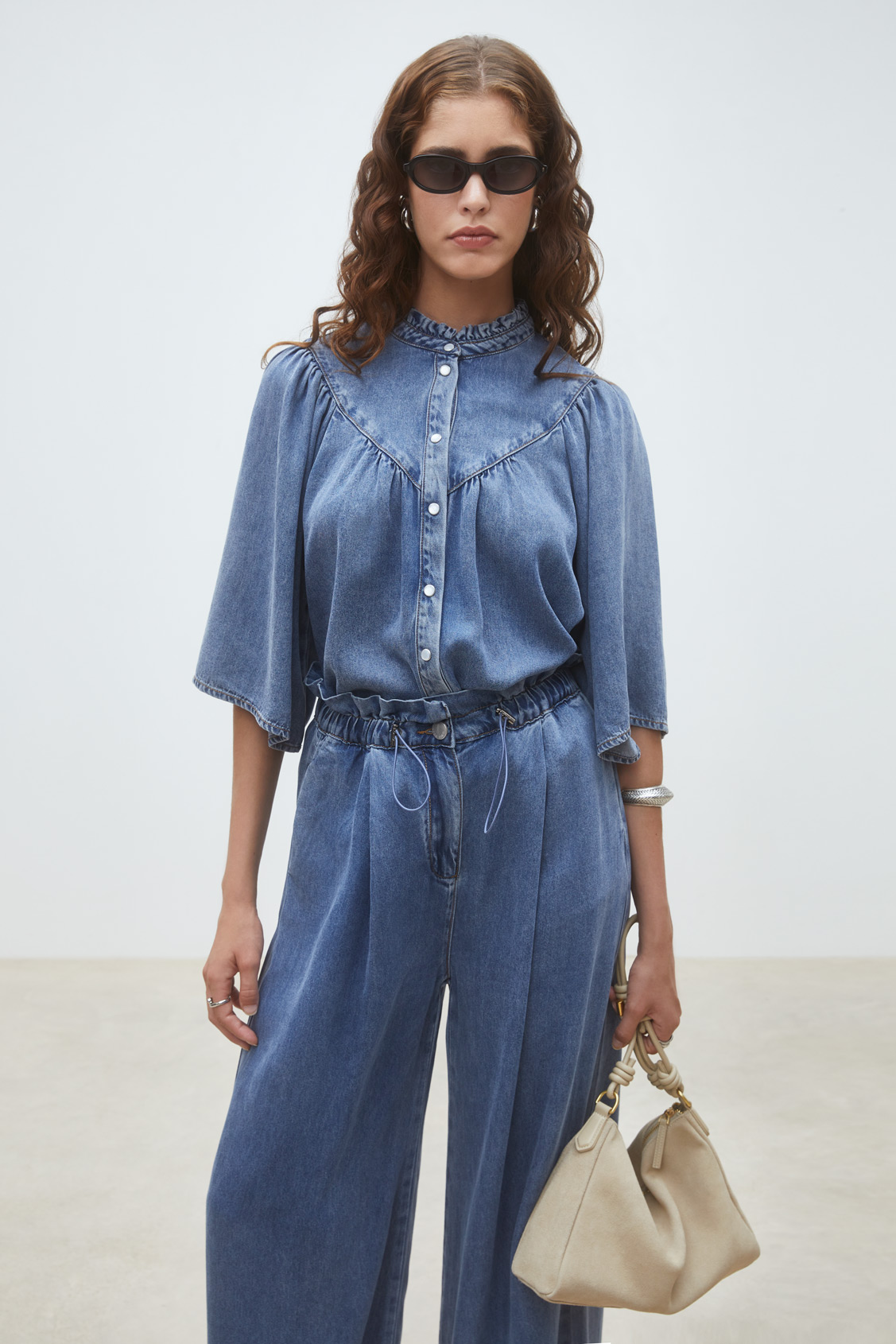 Louise Blouse fra Suncoo er en kortermet denimbluse med høy krage og små volanger. Blusen er laget i et mykt flytende materiale.