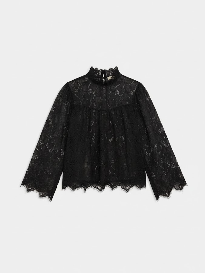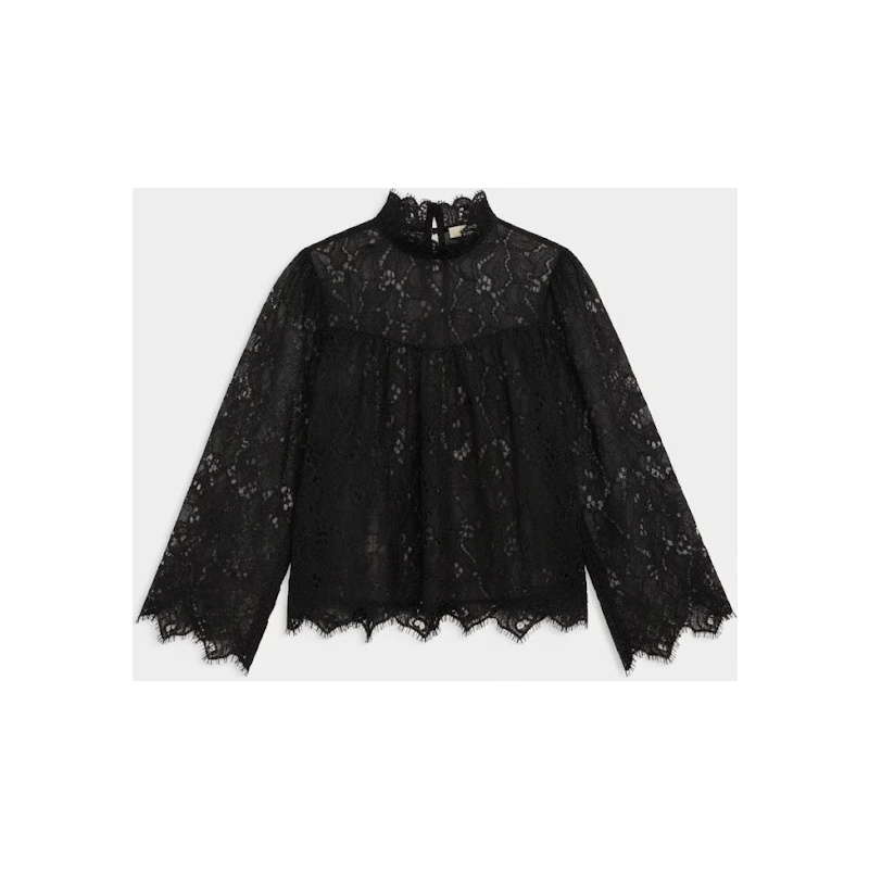 Lucia fra Suncoo er en romantisk blondebluse. Blusen er sydd i en delikat sort blonde med blomsterstruktur. Den har høy hals og 3/4 ermer med bølgede avslutninger. Den lette og transparente kvaliteten gjør den like fin til fest som til hverdags, stylet med jeans eller dressbukser. Følger med undertopp.