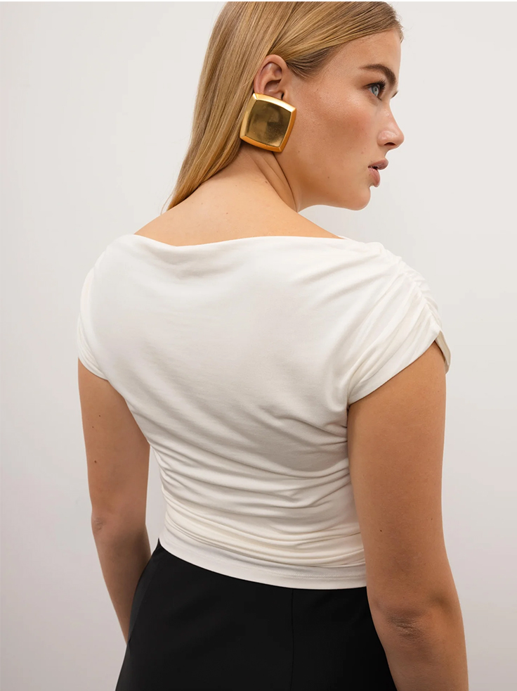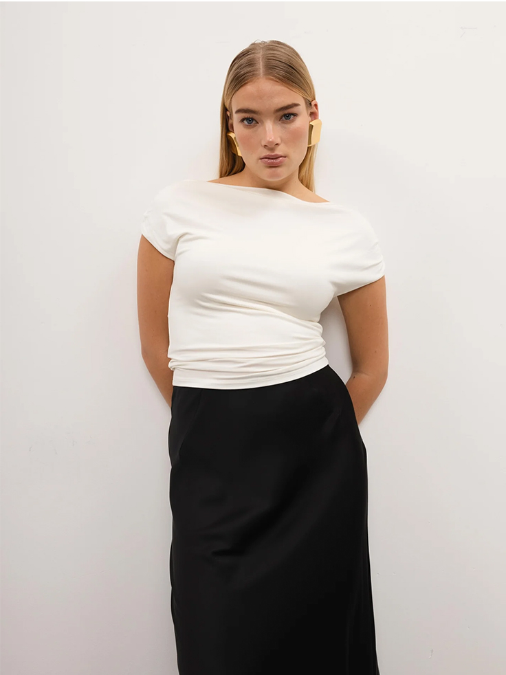 VIVEH Ruta-toppen har en litt mer avslappet passform rundt skuldrene og en bred, hengende utringning, som skaper en elegant drapering over brystet. Den kan bæres både på begge skuldre eller kun på én for et mer asymmetrisk uttrykk.
