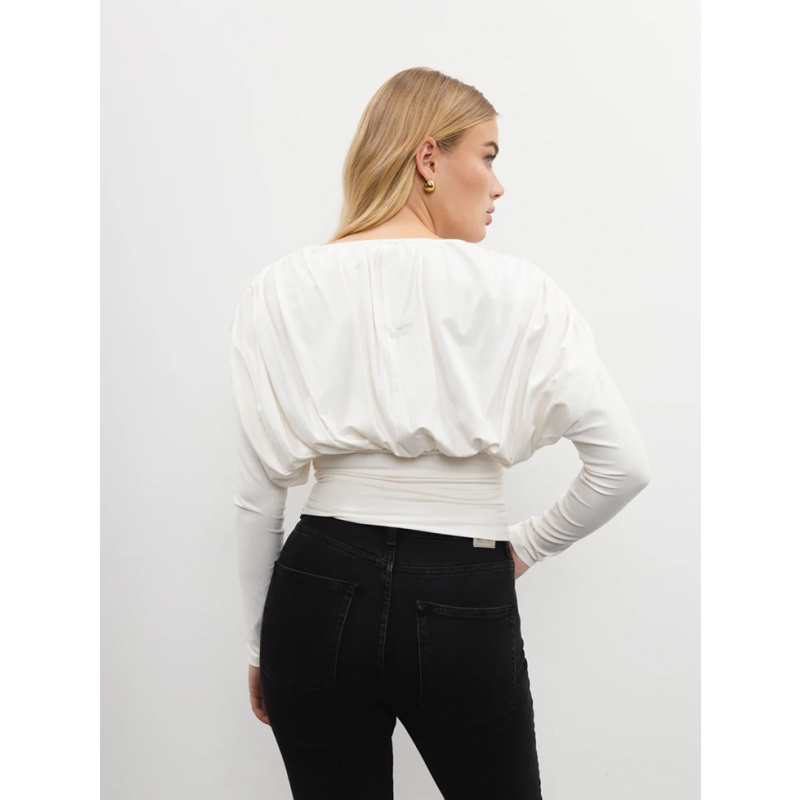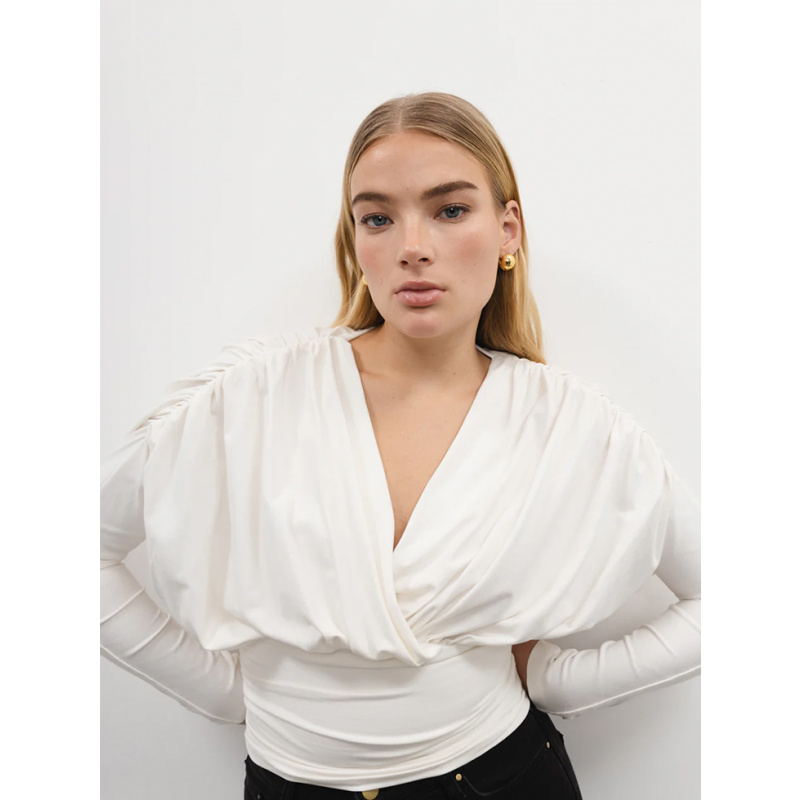 VIVEH Salvia-toppen er laget av VIVEHs signaturstoff, en ECOVERO™ viskose-jersey som draperer vakkert og sitter tett mot kroppen. Plagget har lange ermer, en løs passform over skuldrene og en tettsittende midje.