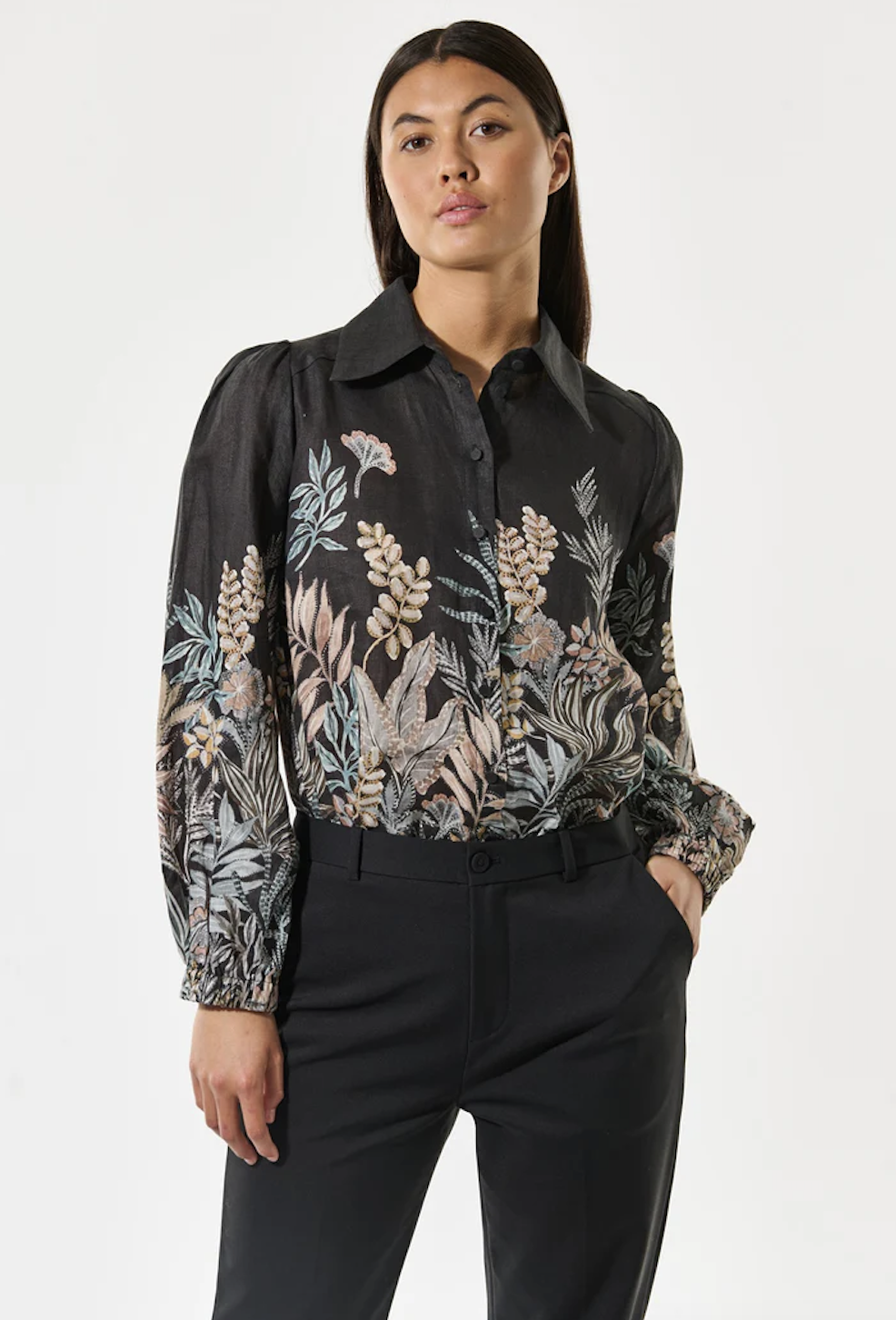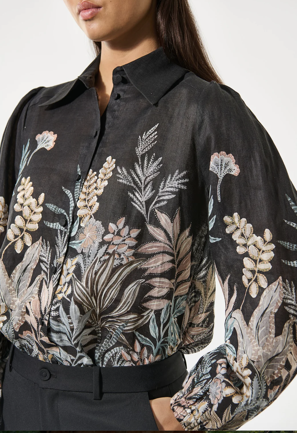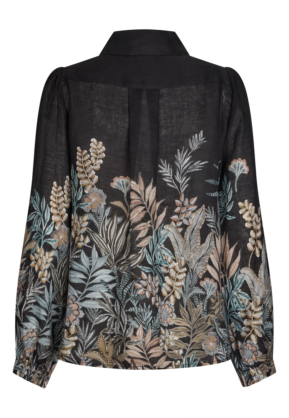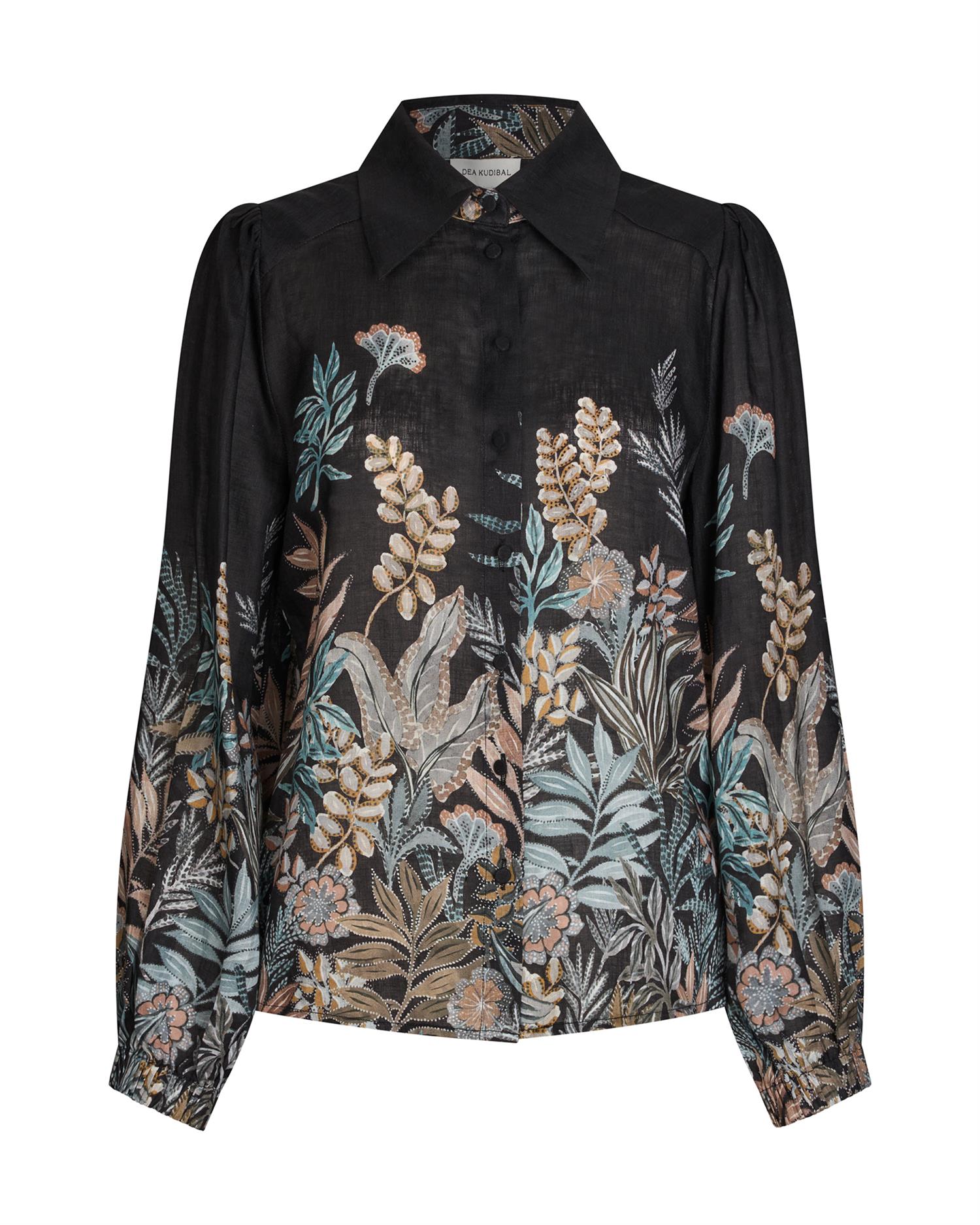 Linskjorte med et eksotisk blomsterprint fra Dea Kudibal. Klassisk skjortekrage, stofftrukne knapper og voluminøse ermer med elastiske mansjetter.
