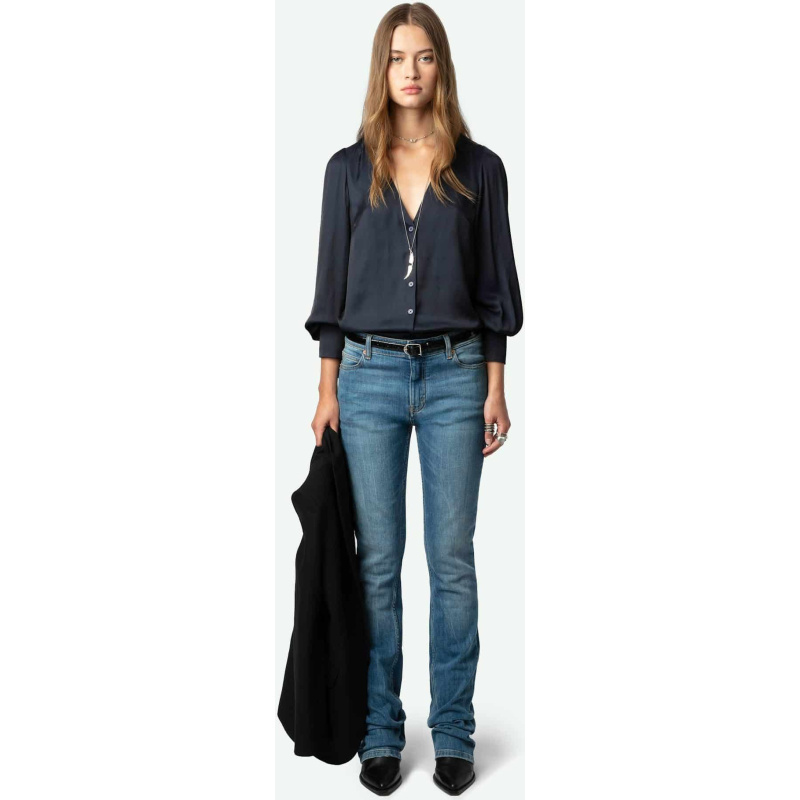 Langermet bluse med volang nederst i poly-viskose, med asymmetrisk kant og splitt. Hovedmateriale: 65% viskose, 30% polyamid, 5% elastan Volang: