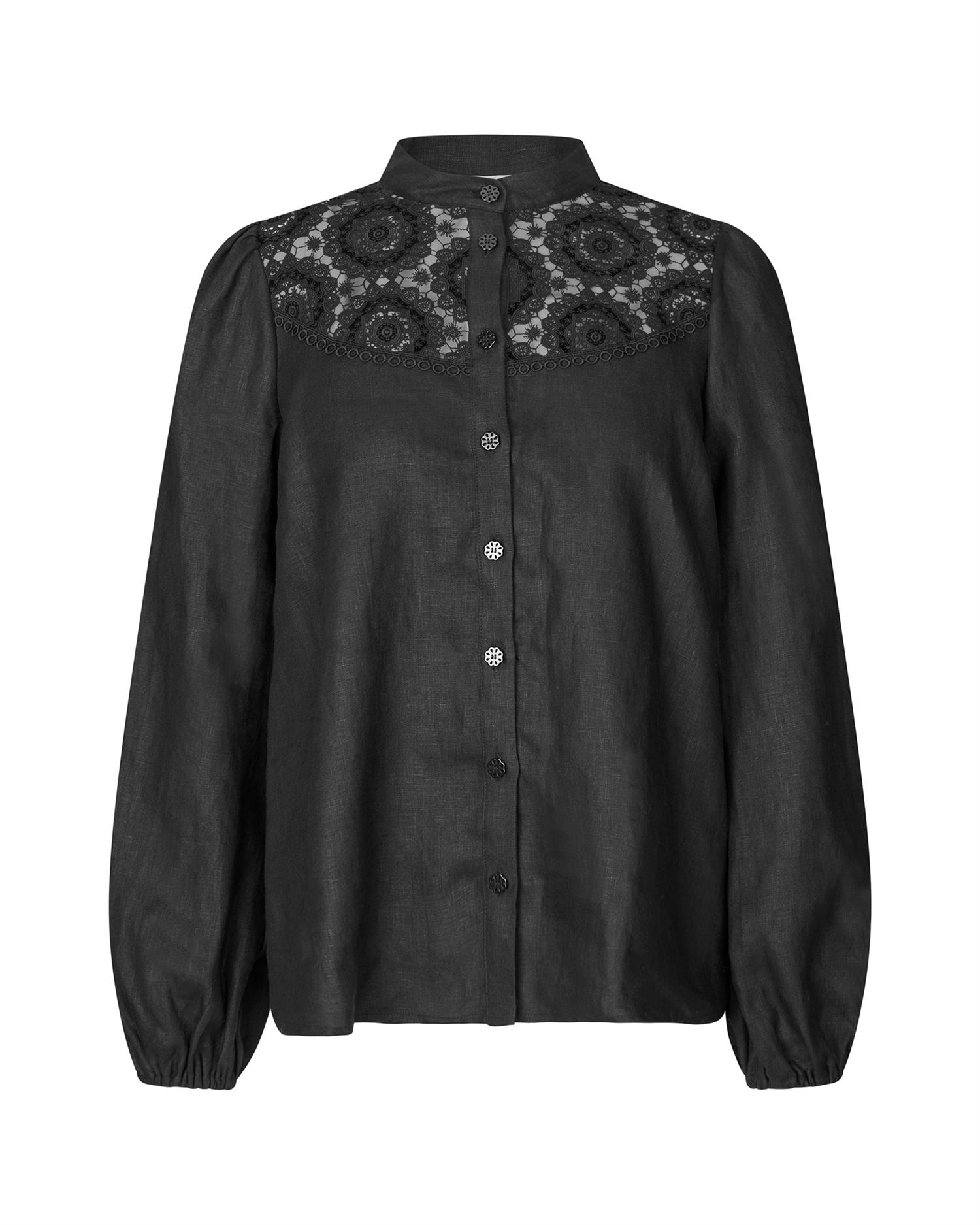 Lucia fra Suncoo er en romantisk blondebluse. Blusen er sydd i en delikat kremfarget blonde med blomsterstruktur. Den har høy