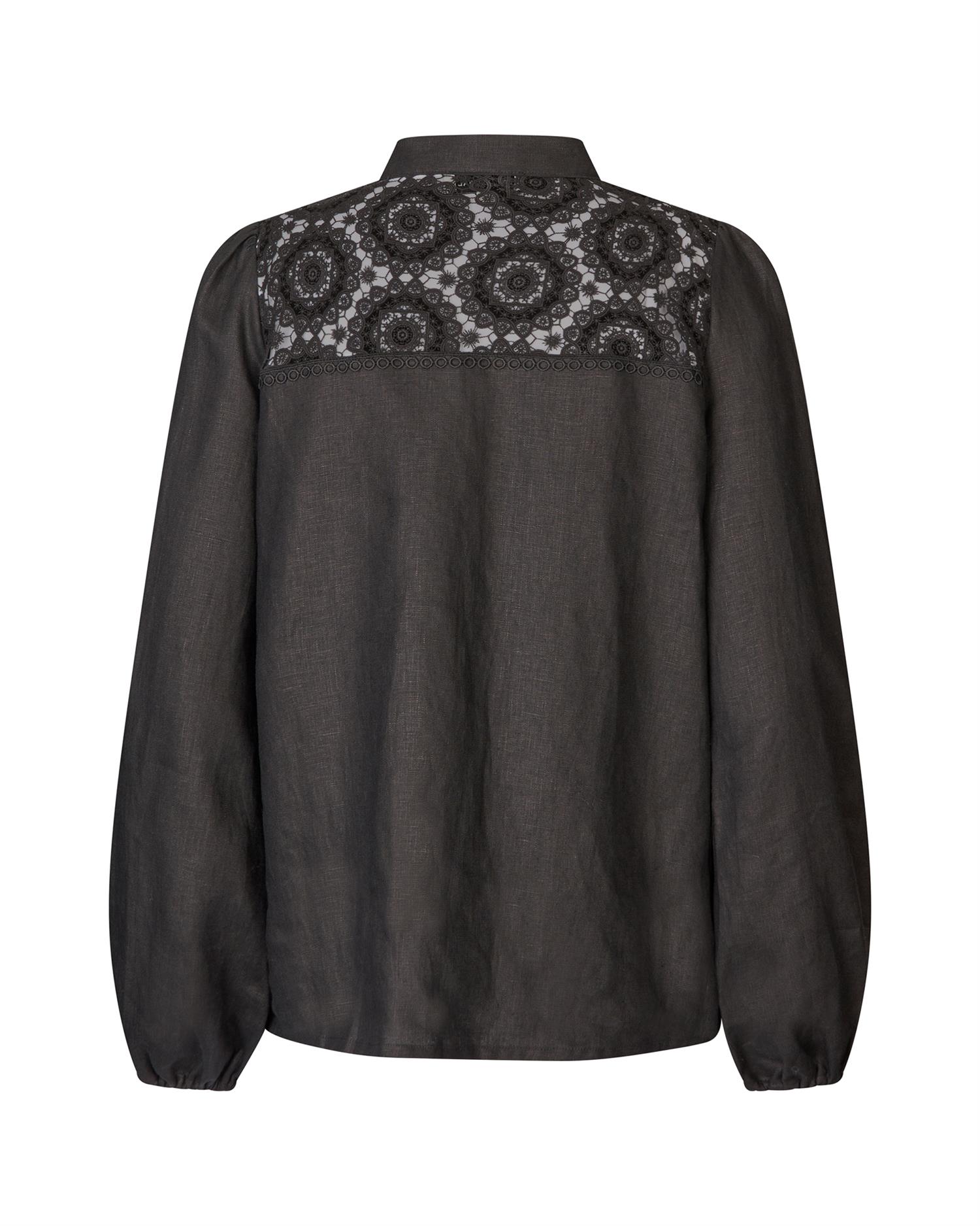 Broderte ermer med blondekant gir en romantisk følelse til denne vakre bomullsblusen. En liten ståkrage med blondedetalj lukkes med en
