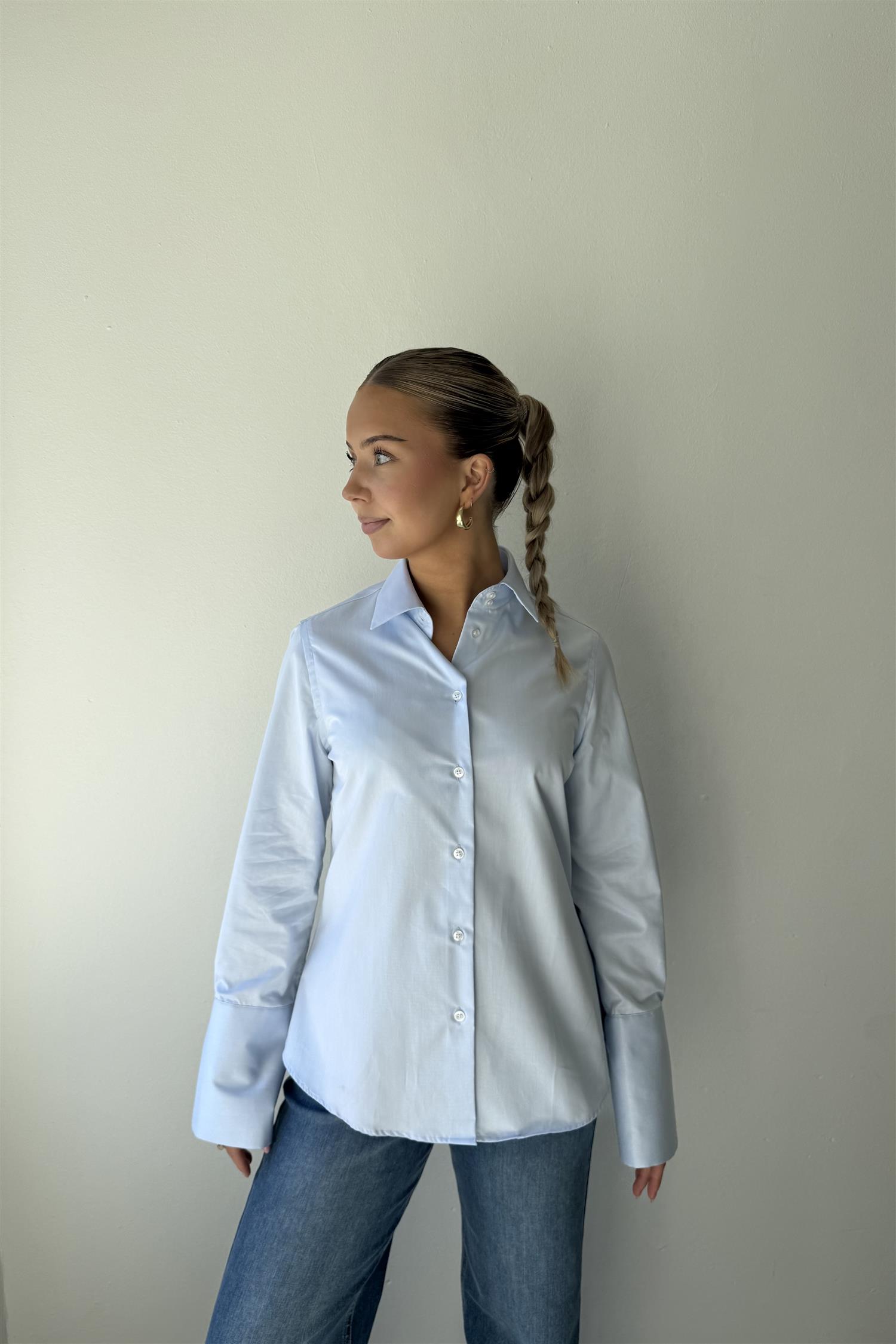 Skjorte med litt utsving nederst. Lange vide ermer med store mansjetter.