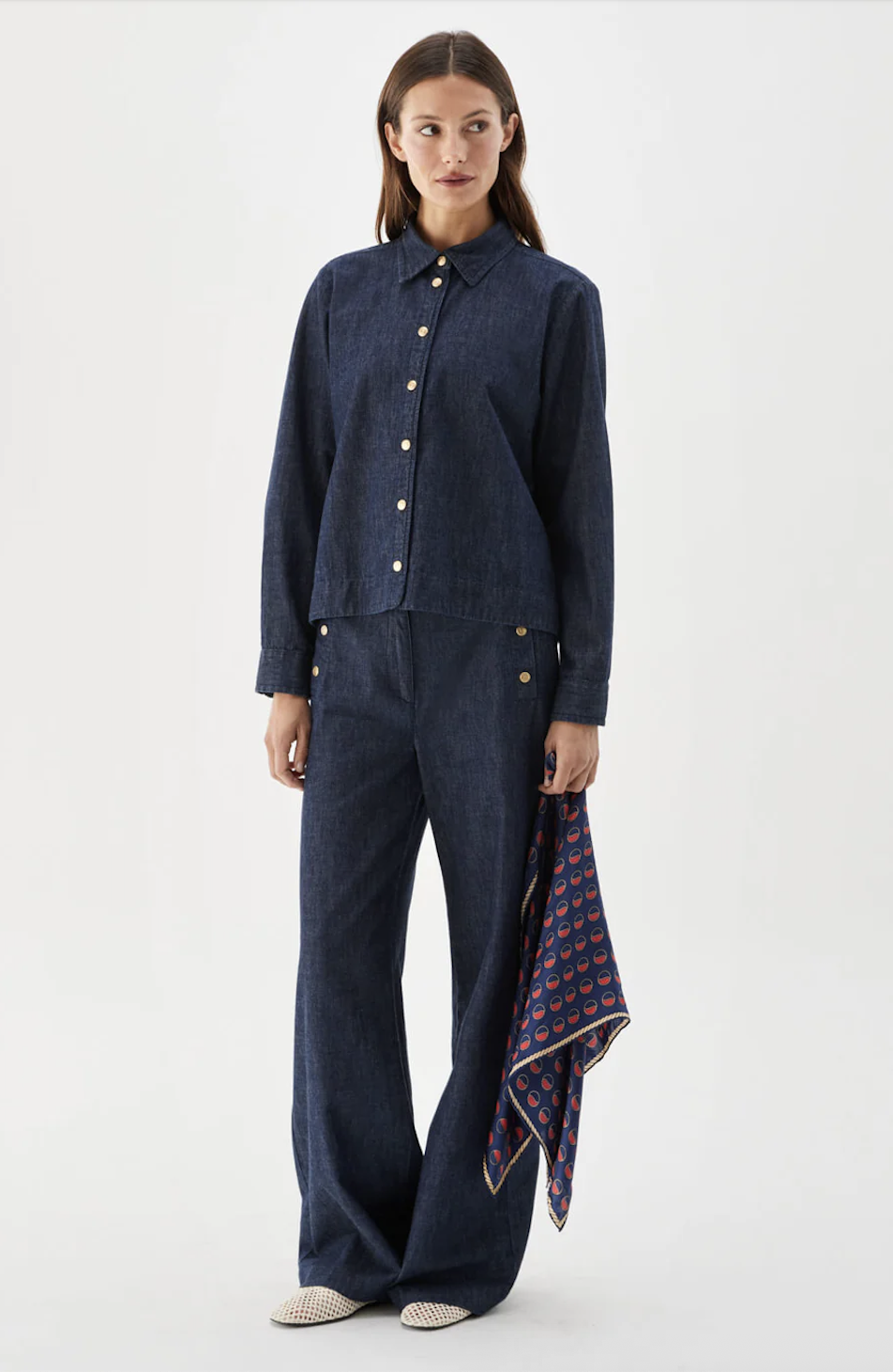 Poppy Denim Shirt. Poppy Denim Shirt fra Busnel er en feminin og forseggjort skjorte laget i myk denim. Den har en normal passform, lange ermer og klassisk skjortekrage. Avrundede detaljer langs knappestolpen og mansjettene gir et mykt uttrykk, mens små gullfargede knapper tilfører en elegant finish.