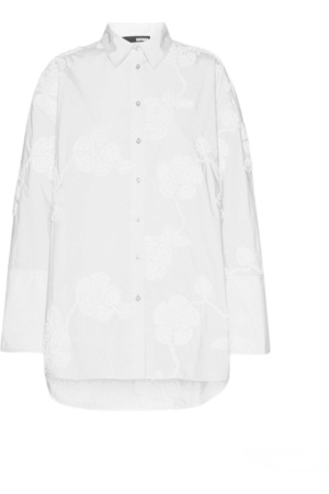Flower Oversized Shirt. Flower Oversized Shirt fra Rotate har detaljerte 3D-blomsterapplikasjoner, klassisk krage og knepping hele veien foran. Overdimensjonerte mansjetter