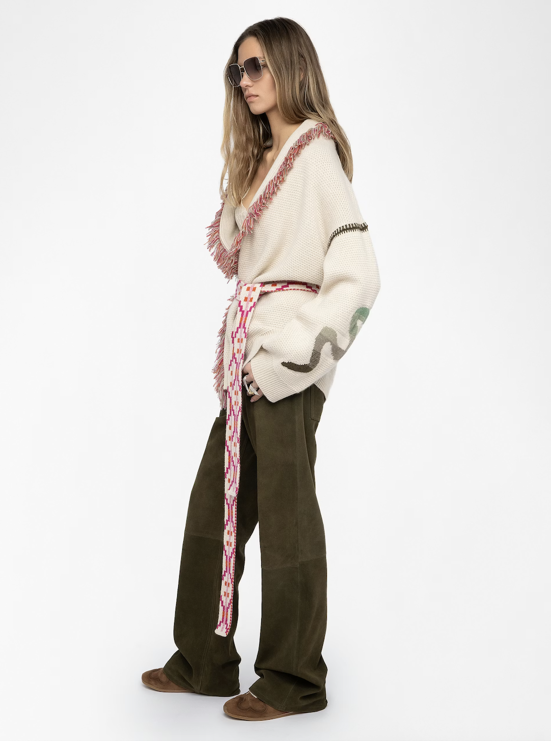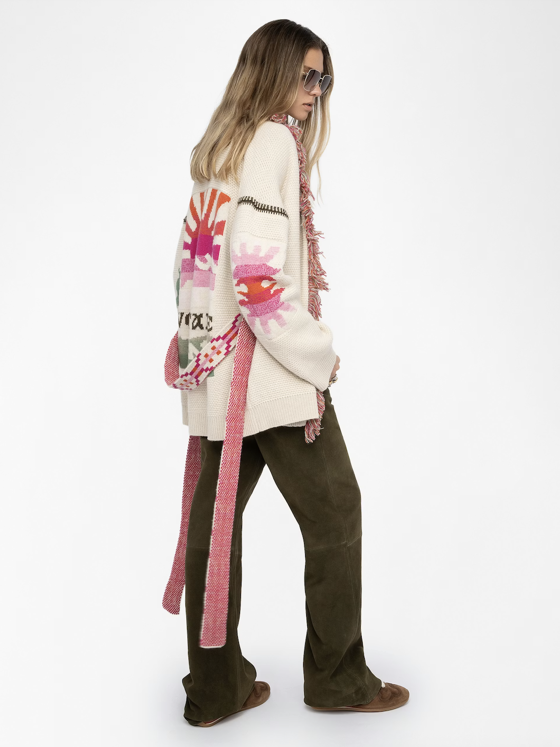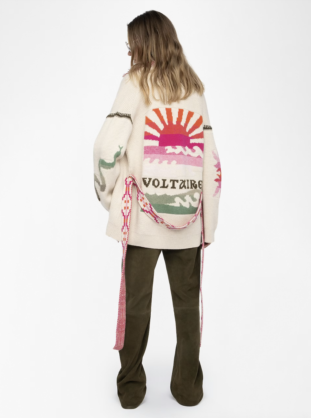 Alpa Sunset. Alpa Sunset fra Zadig & Voltaire er en cardigan-jakke i en kasjmir og ullblanding. Jakken har en stor sjalkrage med frynser og har flere intrikate strikkede mønstre, samt logo. Jakken lukkes med belte.
