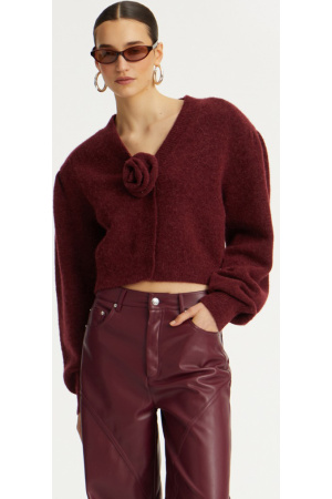 Knit Puffsleeve Cardigan har en dyp V-utringning og en kort, cropped silhuett. De lange ermene har en voluminøs form med rynkede skuldre og tettsittende mansjetter. Den strukturerte looken forsterkes av avtakbare skulderputer. En dekorativ strikket rosett foran i midten er også avtakbar. Ribbestrikkede mansjetter og fald gir ekstra struktur.